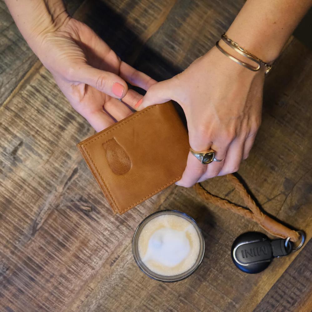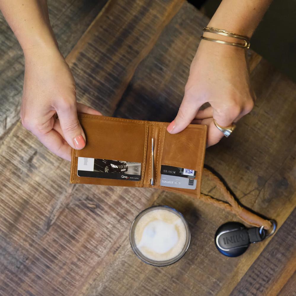 Brun pung i enkelt og klassisk design. Med plads til både sedler, kvitteringer og kort. Pengeclipsen er placeret i midten af pungen, hvilket gør det let at komme til dine kontaner, når du åbner pungen. Der er et rum velegnet til kvitteringer, og der er 6 kortlommer i alt. Pungen er i blødt sort læder og tynd i sit design, og fylder derfor ikke meget i lommen.