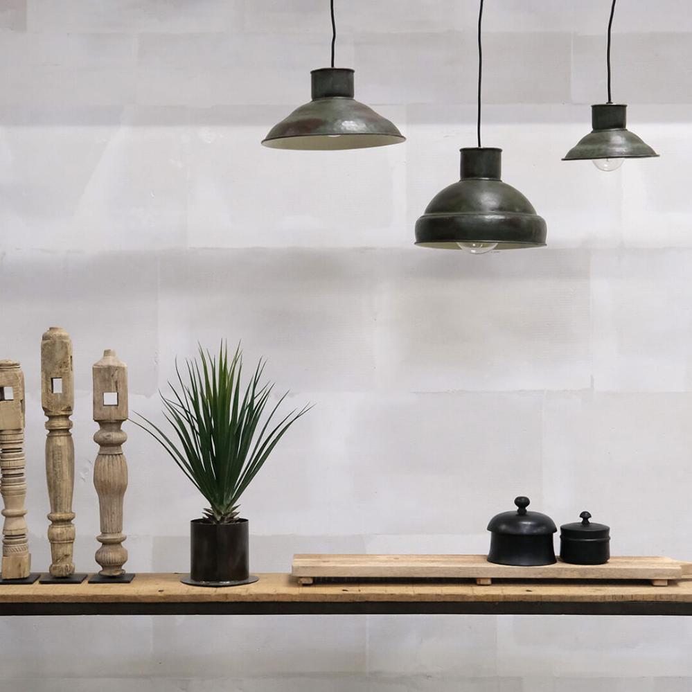 Denne loftslampe kombinerer et fabriksinspireret design med en skøn mørkegrøn overflade, der giver et råt og samtidig stemningsfuldt udtryk. Lampen er fremstillet i jern og leveres med sort stofledning, som understreger det industrielle look. Den fungerer flot både alene og i kombination med flere på række, fx i entreen, i køkkenet eller i caféindretning, hvor du ønsker en autentisk og personlig atmosfære. Lampen fås også i en større model med en diameter på Ø35 cm. Find den ved at søge efter M08365 i webshoppen.