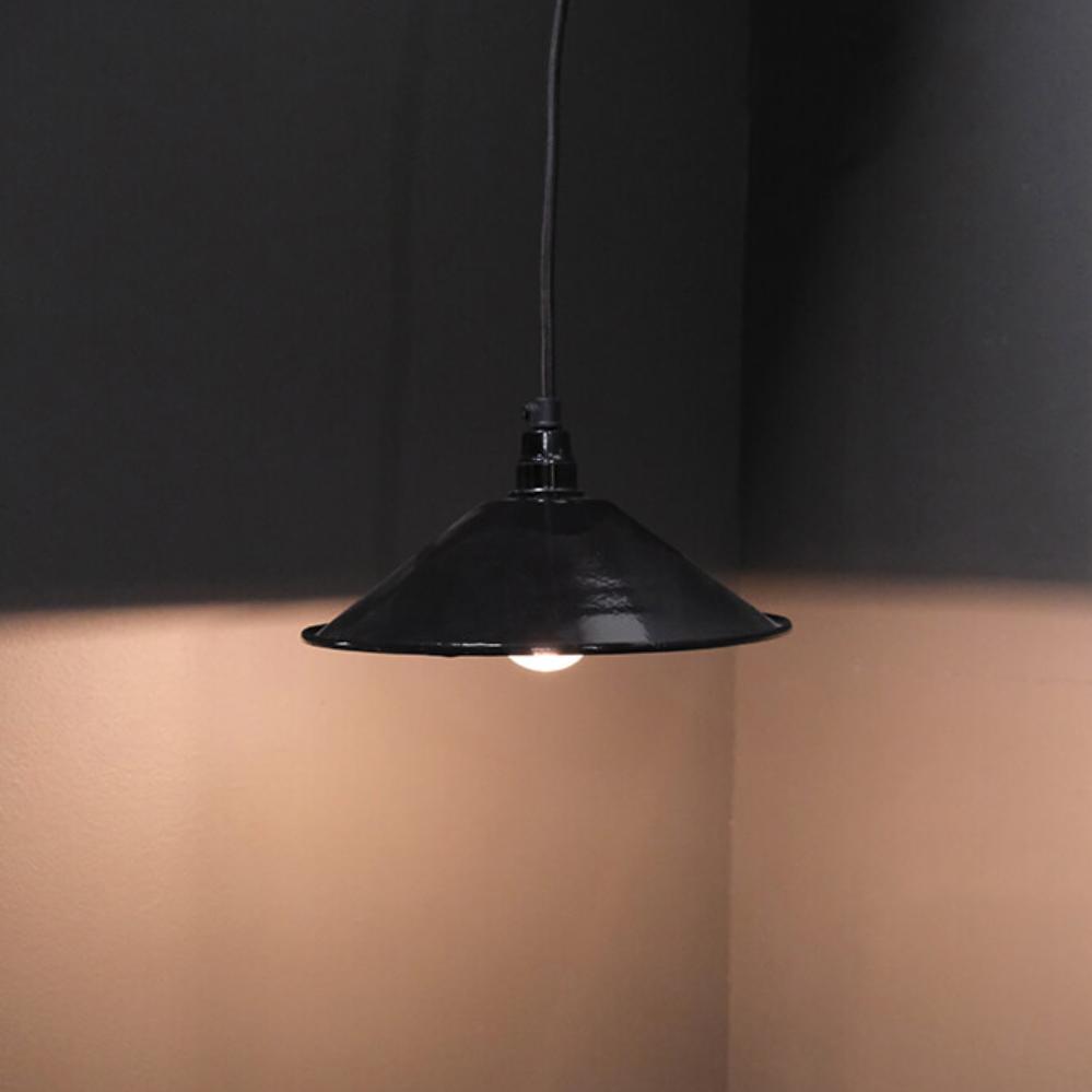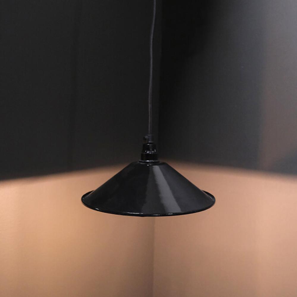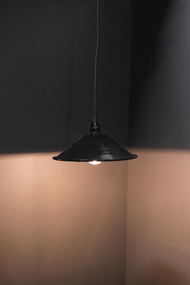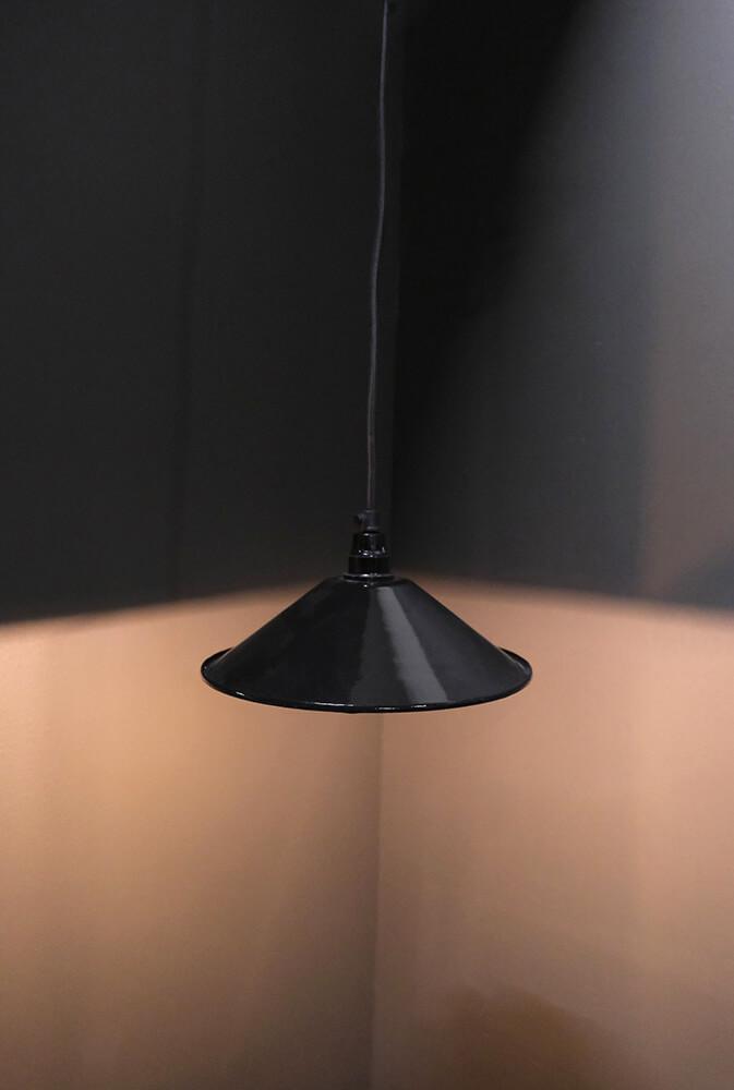 Lille fin lampeskærm, der har fået et lag sort emalje, som har givet lampen sit lækre finish. Lampen er hvid inden i skæmen for en optimal fordeling af lyset i rummet. Lampen har en to meter lang sort stofledning. Denne loftslampe fylder ikke meget og vil derfor kunne passe ind de fleste steder. Hæng gerne flere sammen for et coolt udtryk.