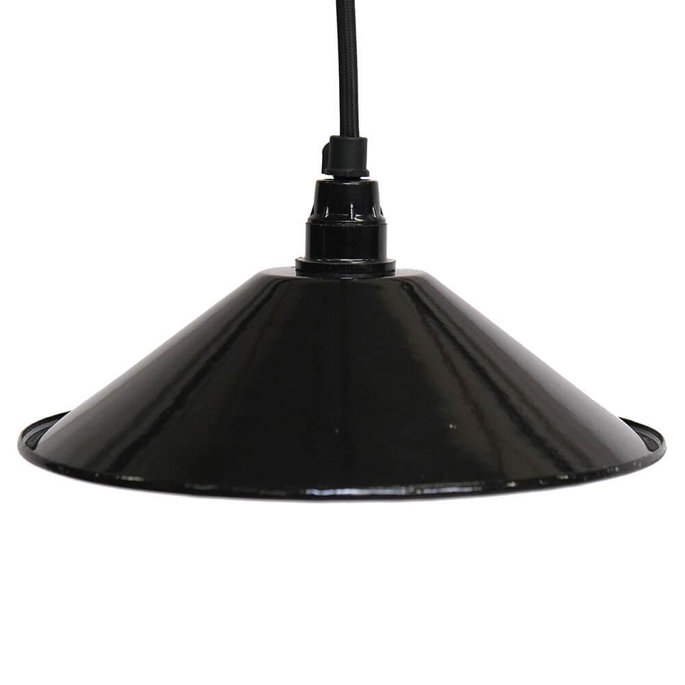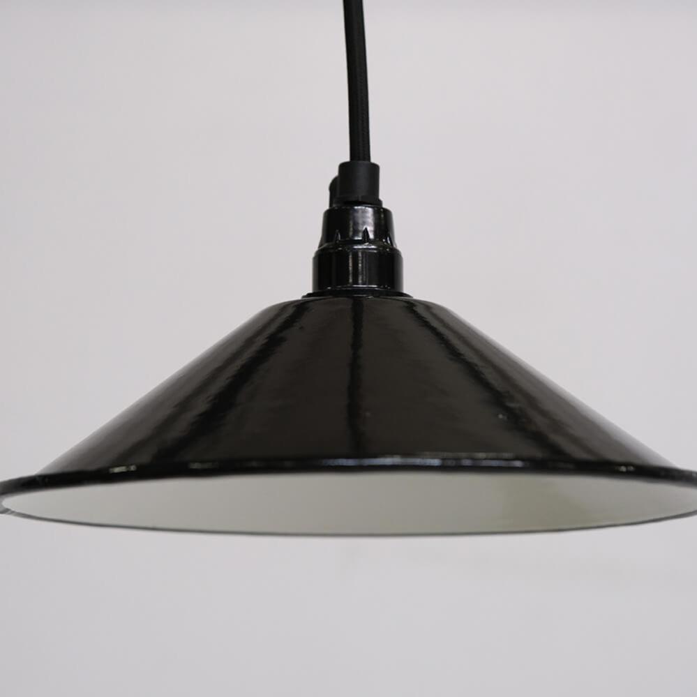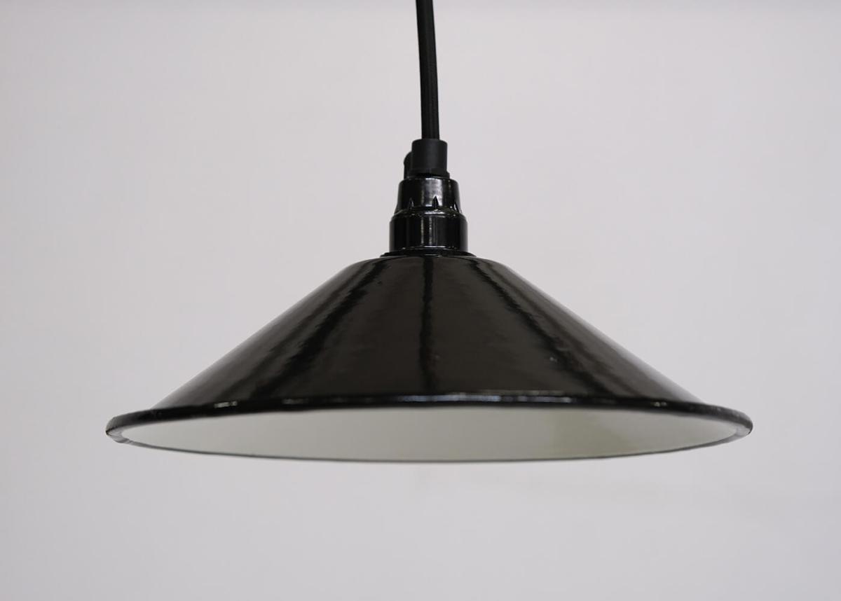 Lille fin lampeskærm, der har fået et lag sort emalje, som har givet lampen sit lækre finish. Lampen er hvid inden i skæmen for en optimal fordeling af lyset i rummet. Lampen har en to meter lang sort stofledning. Denne loftslampe fylder ikke meget og vil derfor kunne passe ind de fleste steder. Hæng gerne flere sammen for et coolt udtryk.