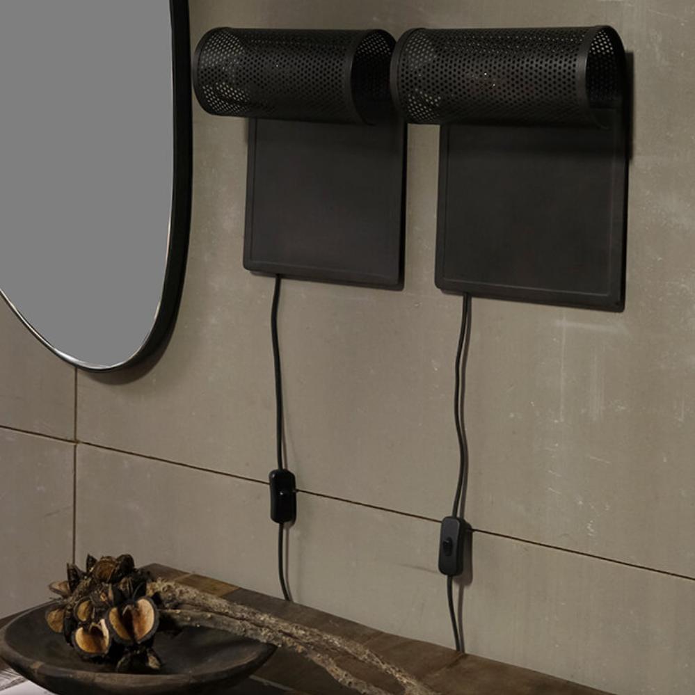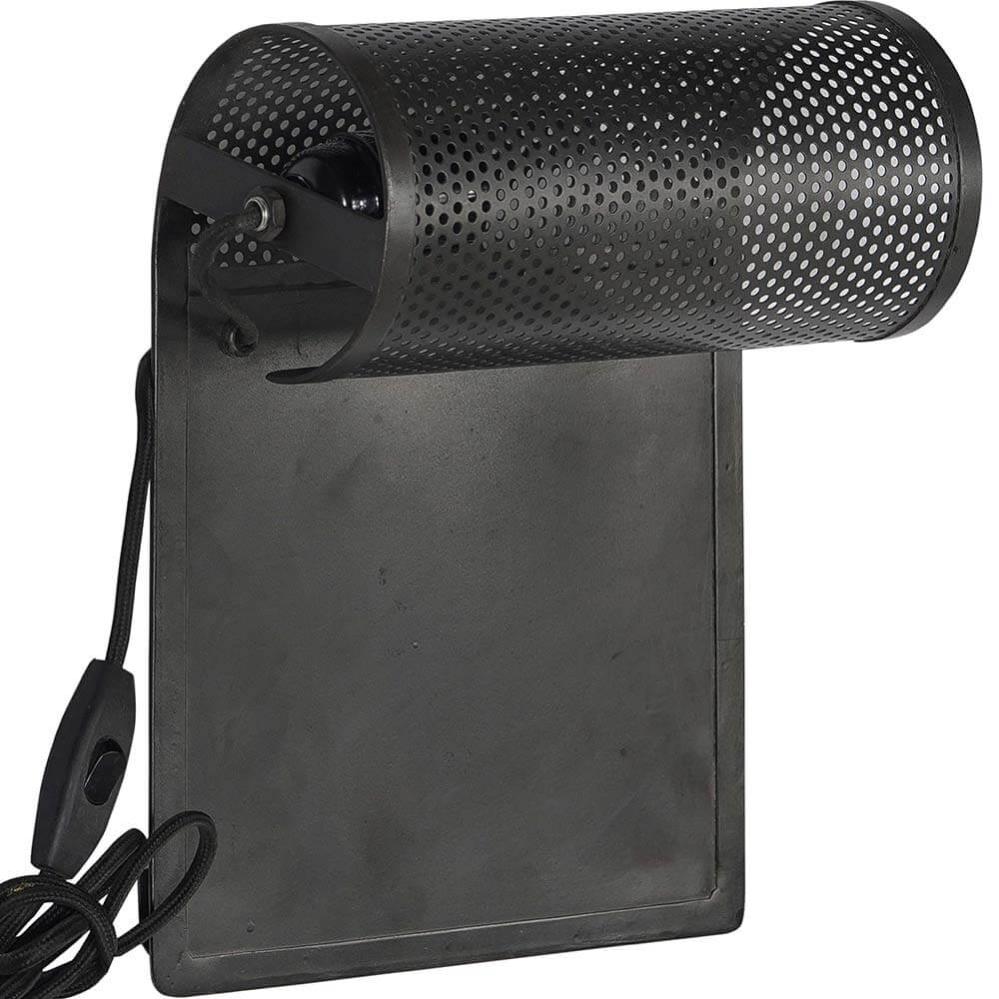 Denne væglampe i mørkt jern kombinerer funktion og charme. Lampens perforerede skærm skaber et blødt, diffust lys, der giver rummet en hyggelig atmosfære. Det industrielle design fremhæves af den robuste konstruktion og den mørke finish. Lampens lille flade fungerer som en praktisk magnetisk tavle, perfekt til små noter eller dekorative magneter. Ideel til kontoret, hotellet eller som stemningsfuld belysning i stuen. Denne lampe tilføjer både funktionalitet og karakter til din indretning.