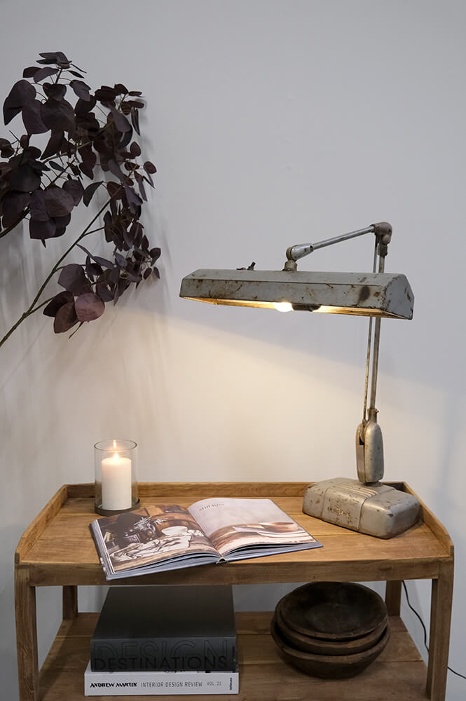 Denne bordlampe har mere karakter end de fleste! Med sin rustne finish og slidte look oser den af autenticitet og rå charme. Det industrielle design med den tunge base og den justerbare arm gør den både funktionel og en ægte statement piece. Patinaen fortæller om et langt liv – måske har den stået på et gammelt kontor eller i en værkstedshal, hvor den har oplyst kreative projekter. Perfekt som skrivebordslampe for dem, der elsker vintage og industrielt design. Brug den i din restaurant eller butik for at tilføje et råt, upcycled touch til rummet, eller placér den i hjemmet på kontoret eller i stuen, hvor den kan tilføre masser af personlighed. Den er både dekorativ og praktisk – og lidt af en samtalestarter!