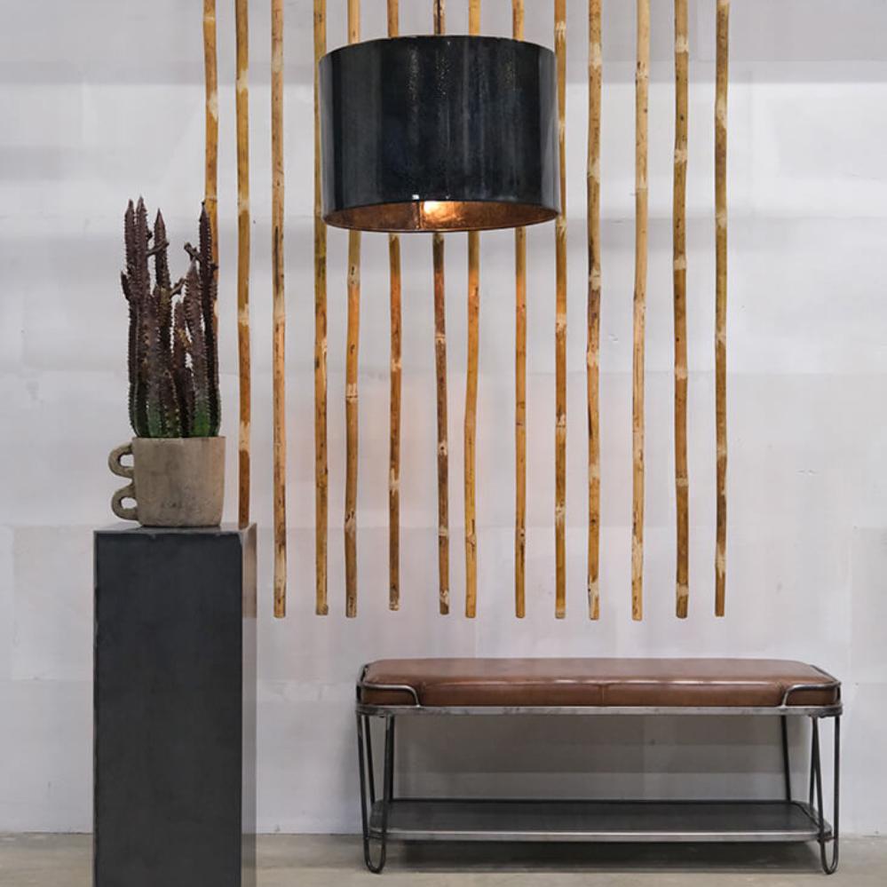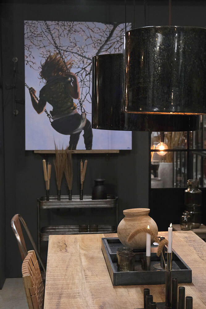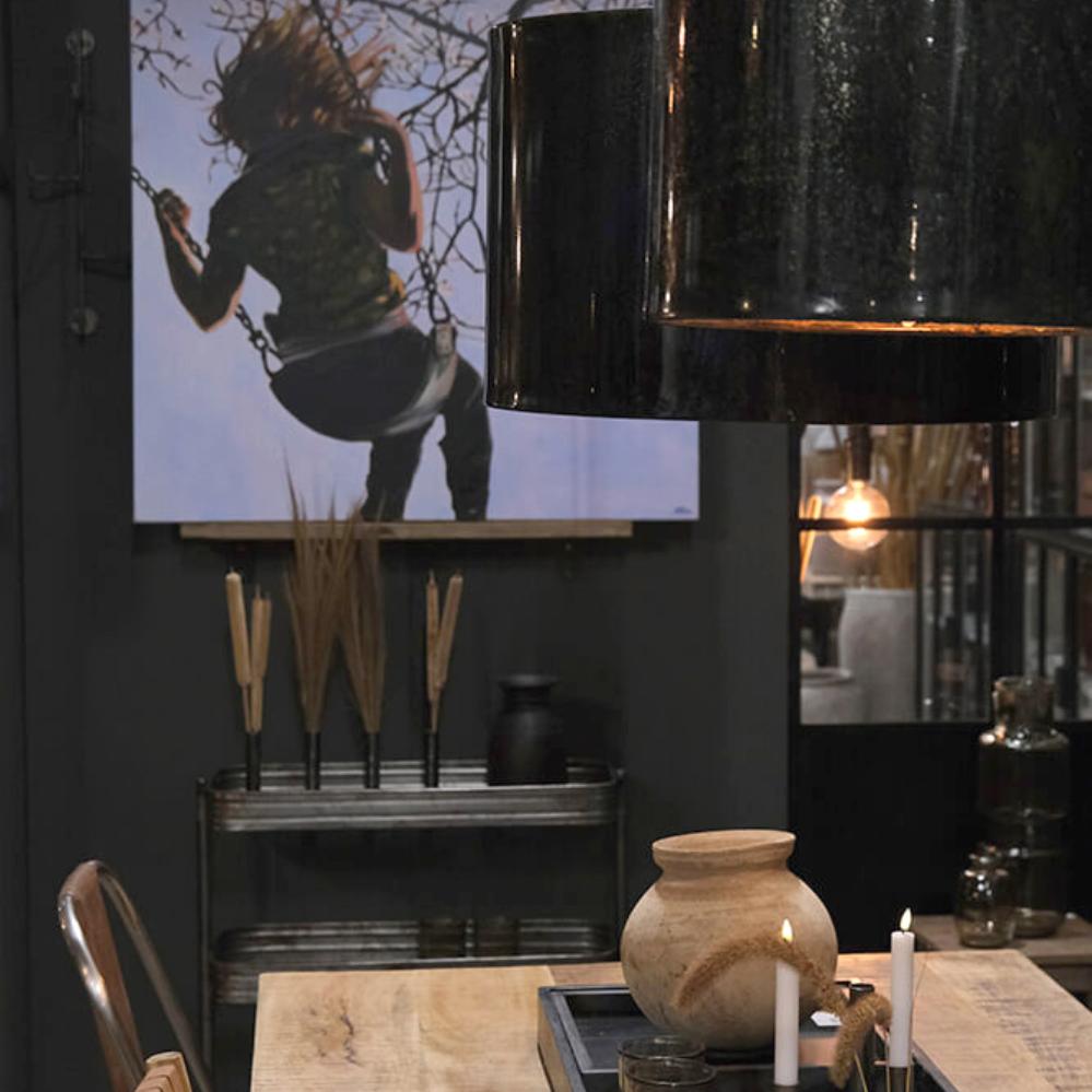 Denne store Jonah loftslampe er skabt til at gøre indtryk. Den brede cylindriske form i jern kombineret med den mørkeblå marmorering giver lampen et markant og sofistikeret udtryk, som tilfører dybde til indretningen. Den generøse størrelse gør lampen ideel som centerpiece over spisebordet, i stuen eller i en café, hvor den kan fylde rummet med både lys og stemning. Overfladen med den diskrete marmorering giver et levende spil i metallet, der understreger lampens unikke karakter. En sort stofledning fuldender designet og skaber en smuk balance mellem rå industri og moderne stil.