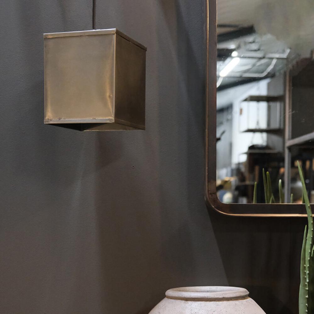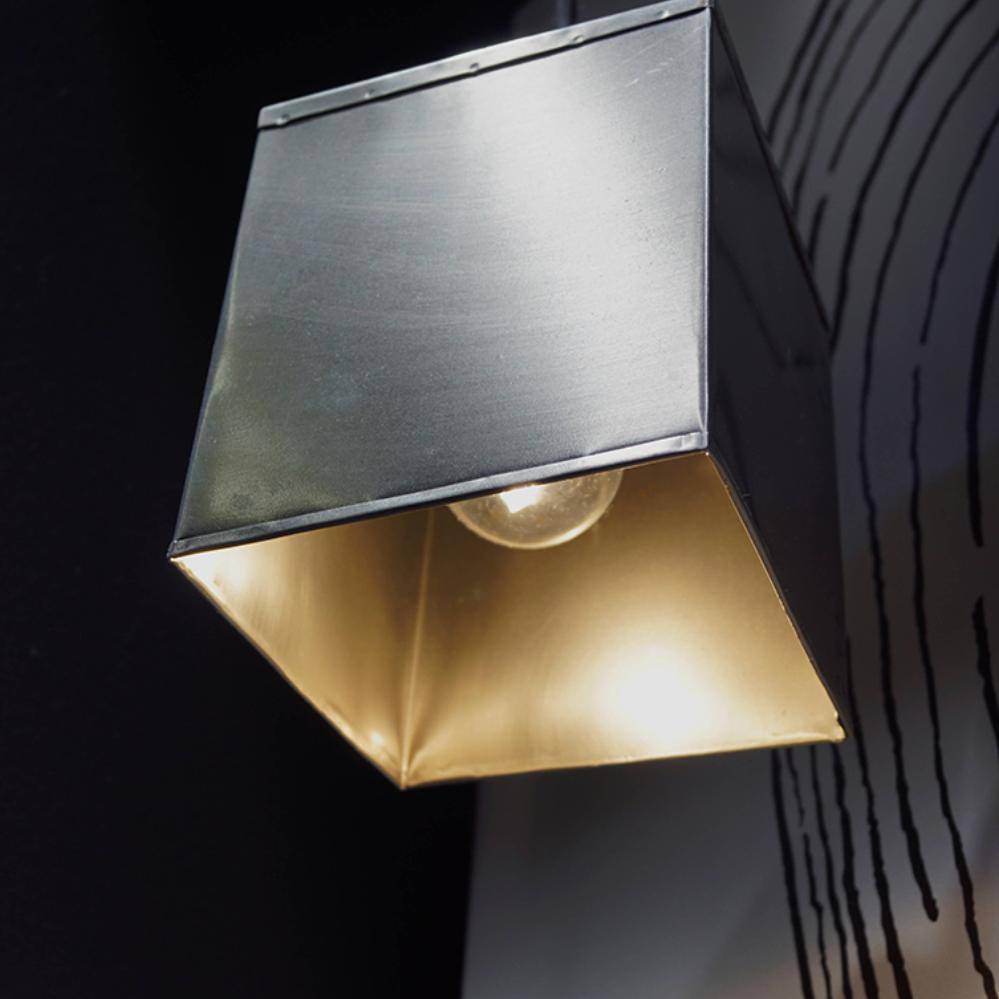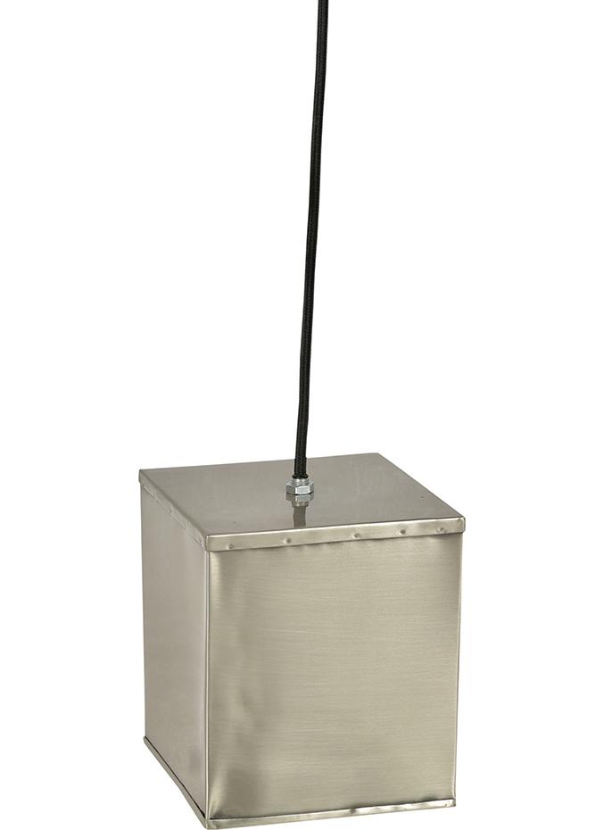 Denne loftslampe skiller sig ud med sit kantede, kubiske formsprog og rå industrielle udtryk. Den er fremstillet i metal med en shiny børstet lignende overflade, der giver en moderne og minimalistisk finish. Den enkle form gør lampen nem at integrere i forskellige typer indretning, både i hjemmet, caféen eller i butikken. Lampen giver et direkte lys, der egner sig perfekt over spisebordet, i køkkenet eller som et spændende element i et hjørne. Den sorte stofledning understøtter lampens stilrene udtryk og giver en flot kontrast til metallet.
