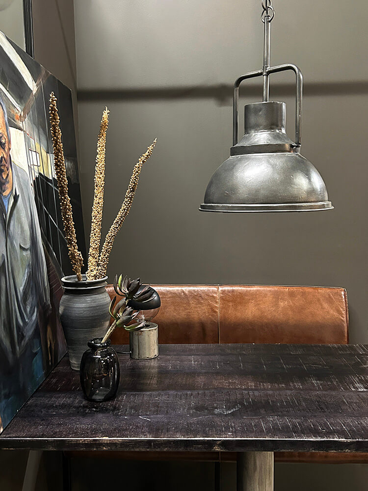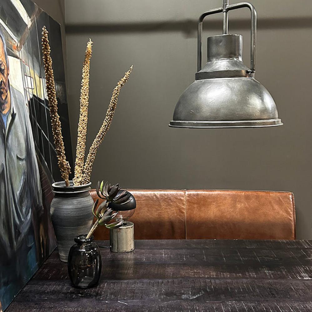 Skab en gennemført fabriksstil med en Liam pendel. Denne industrielle loftslampe har en rå overflade og en lys cremefarvet inderside. En jernkæde er fastgjort til den patinerede lampeskærm og baldakin, hvilket tilføjer et ekstra, rustikt touch til den klassiske loftslampe. Lampen har jordledning og er udstyret med en E27-fatning, der passer til alle vores LED-pærer, som du finder her på shoppen.