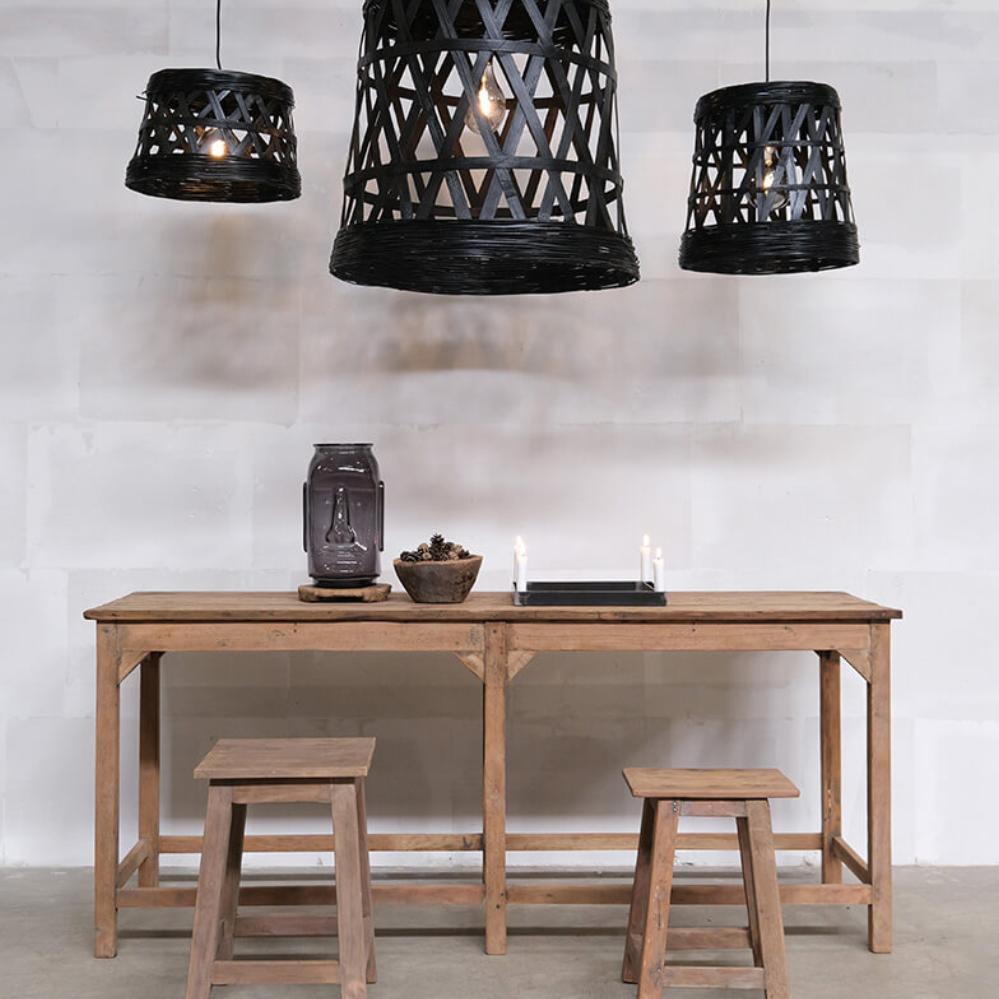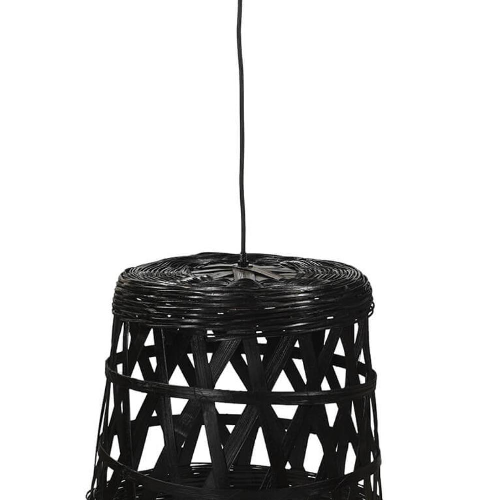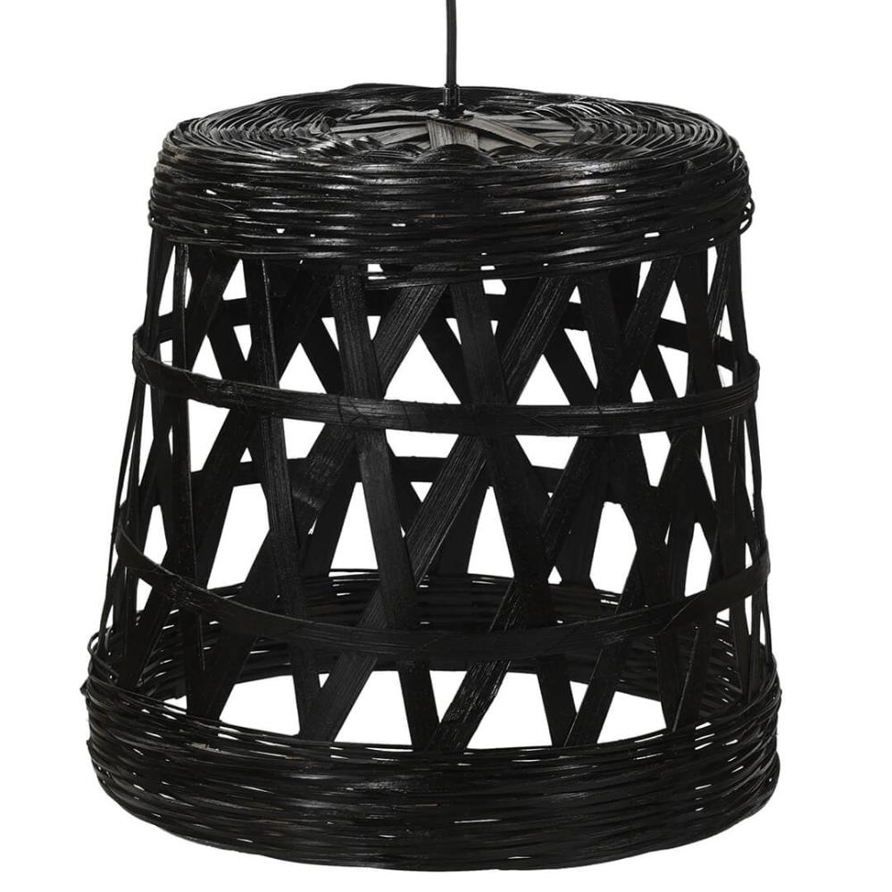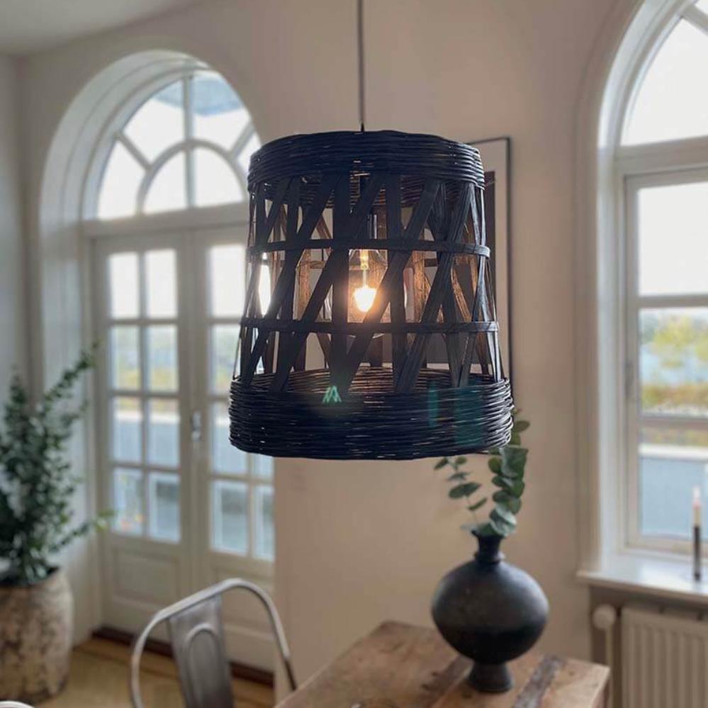 Denne lampe er fremstillet i håndflettet bambus og har et råt og moderne udtryk med sit åbne, geometriske fletmønster. Bambusen er sortmalet, hvilket giver lampen et stilrent og tidløst look, der passer perfekt ind i både nordisk og boheme-inspireret indretning. Med en diameter på 34 cm i toppen har lampen en fin størrelse, der gør den ideel både over spisebordet, i stuen eller som stemningsskaber i en café eller restaurant. Når lampen tændes, skaber det åbne flet et flot spil af lys og skygger, der giver rummet en hyggelig atmosfære. Lampeserien findes også i både X-large og small, så du kan vælge den størrelse, der passer bedst til dit behov, eller kombinere flere størrelser for et spændende og personligt udtryk.