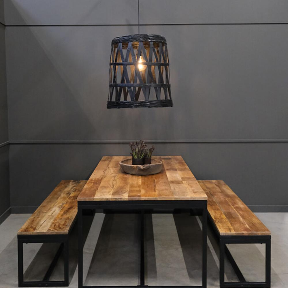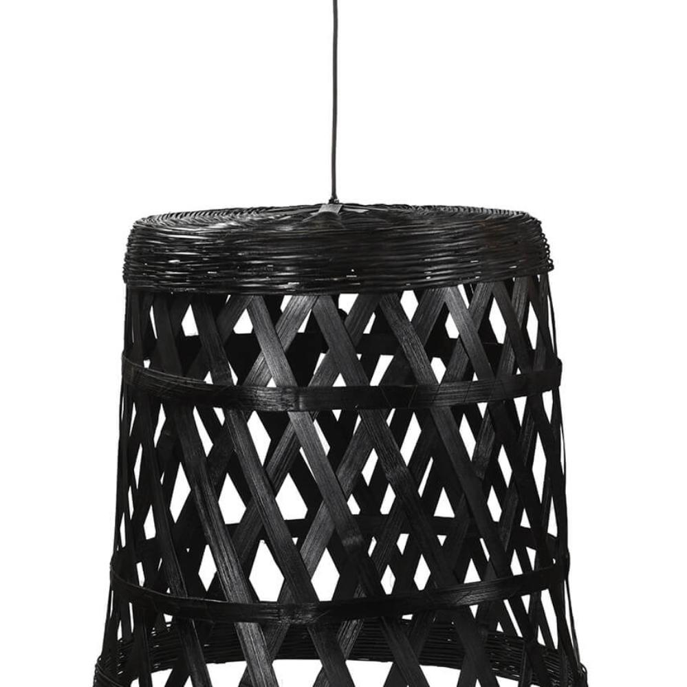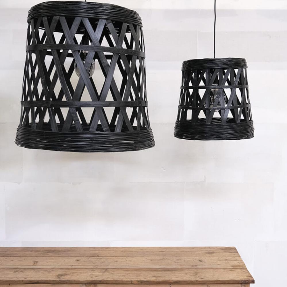 Håndflettet lampeskærm i sortmalet bambus. Lampeskærmen kan bruges, hvor end du ønsker at tilføre din indretning en naturlig og let belysning. Oprindelig var denne lampeskærm tænkt som en kæmpestor kurv, men da vi fik vendt den på hovedet, opstod der magi, og en lampe blev til. Denne gigantiske lampe kræver plads, men du vil få en fantastisk wow effekt i rummet. Fordi lampen er håndlavet, skal du være opmærksom på, at der kan være variation og små forskelle i både finish og farvemætning fra lampe til lampe. Lampens top har en diameter på 61 cm. Denne lampe findes også i medium og small.