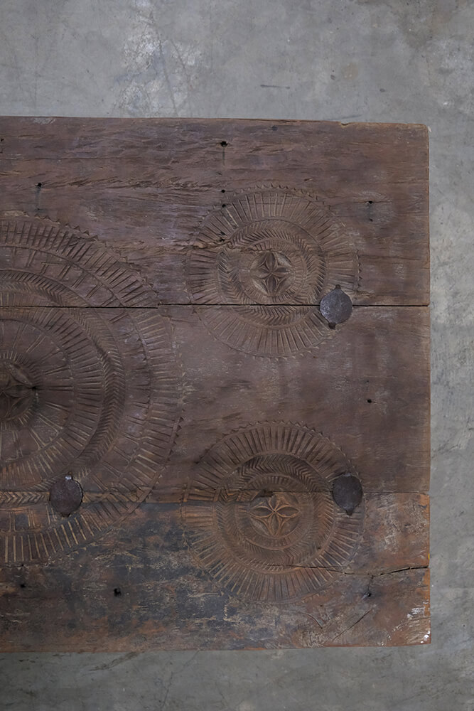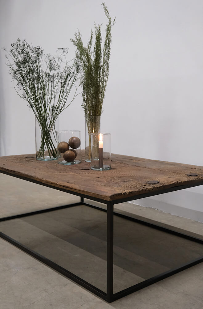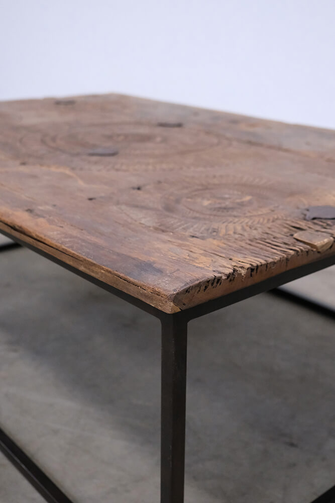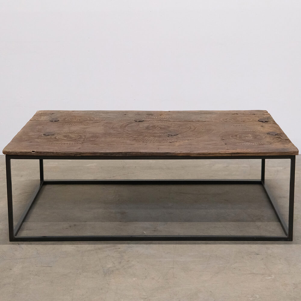 Sofabord med historie og masser af kant. Den unikke bordplade er en gammel dør der har de smukkeste udskæringer og en rustik patina, der fortæller sin egen historie. Stellet i klarlakeret jern giver sofabordet et moderne touch og sikrer stabilitet. Perfekt til dig, der elsker rustik, vintage design med autenticitet og charme.