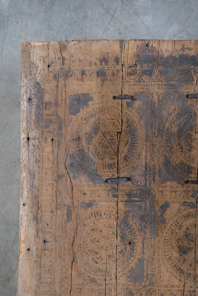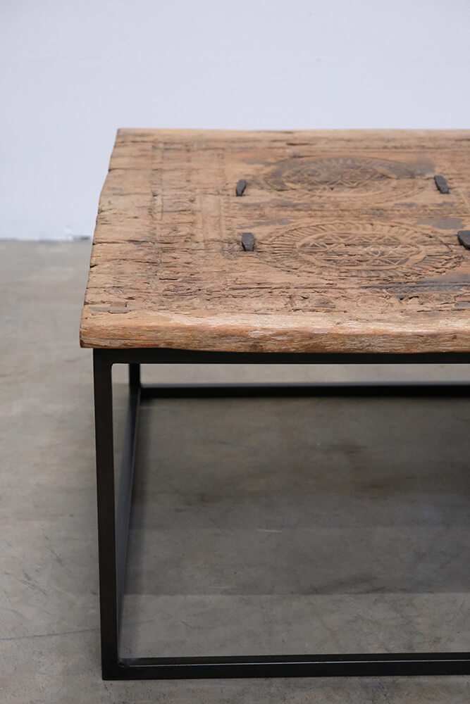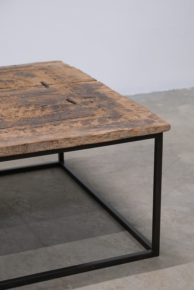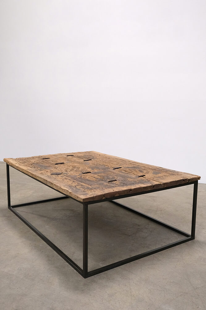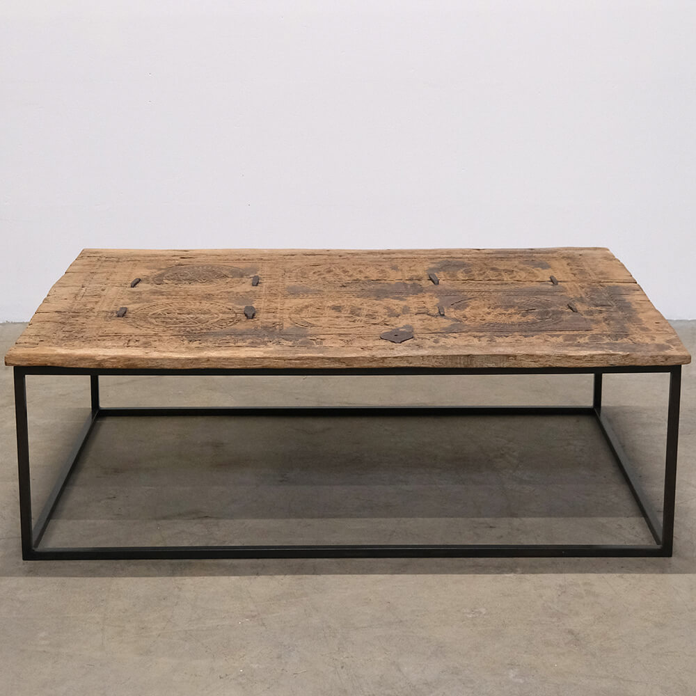Hvorfor vælge et almindeligt sofabord, når du kan få et med karakter? Dette bord kombinerer industrielt håndværk med rustik autenticitet. Bordpladen, der er lavet af en gammel dør, har bevaret sine smukke detaljer og slidte charme, mens jernstellet tilfører en moderne kant. Et one-of-a-kind møbel til både caféer, loungemiljøer og private hjem, hvor der er plads til personlighed..