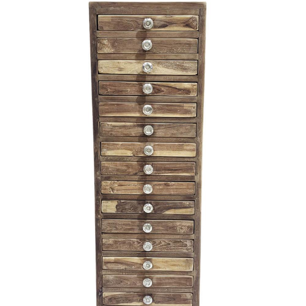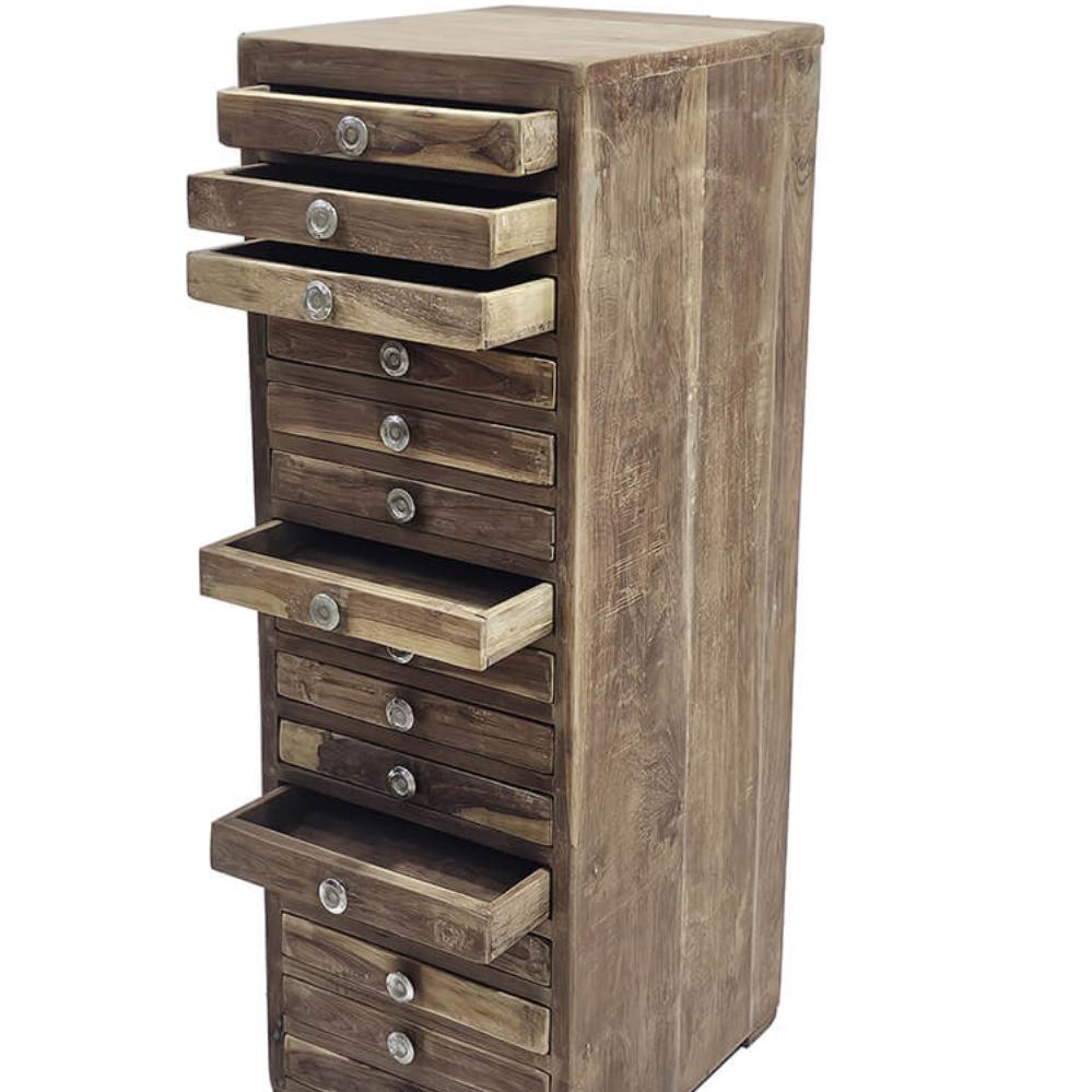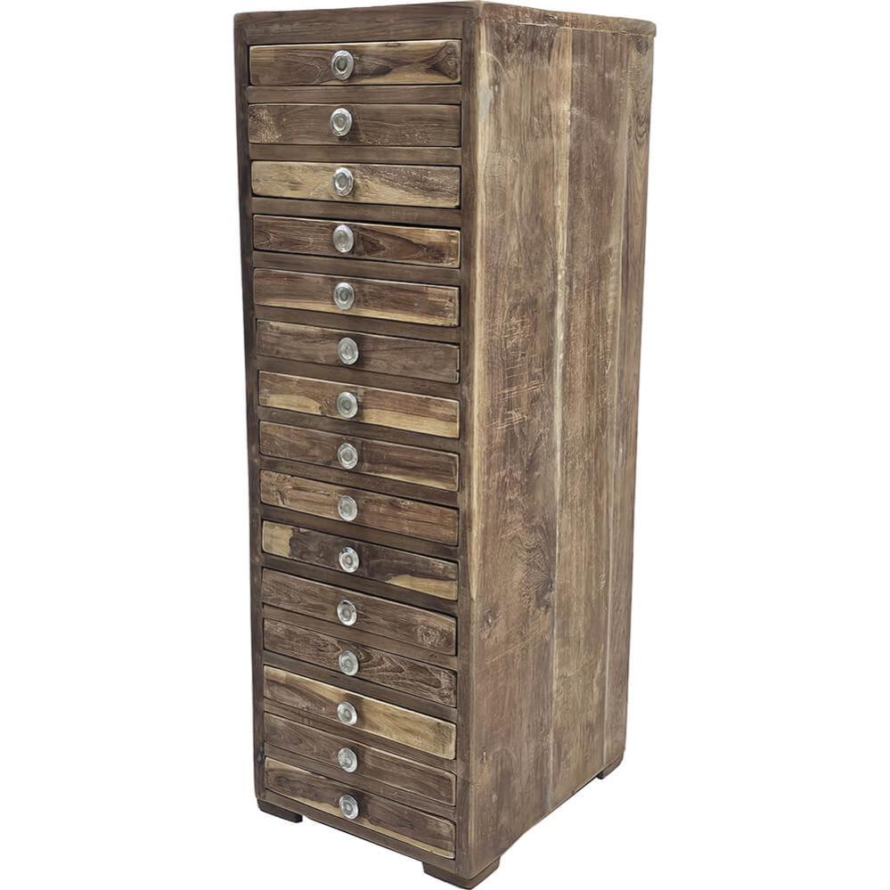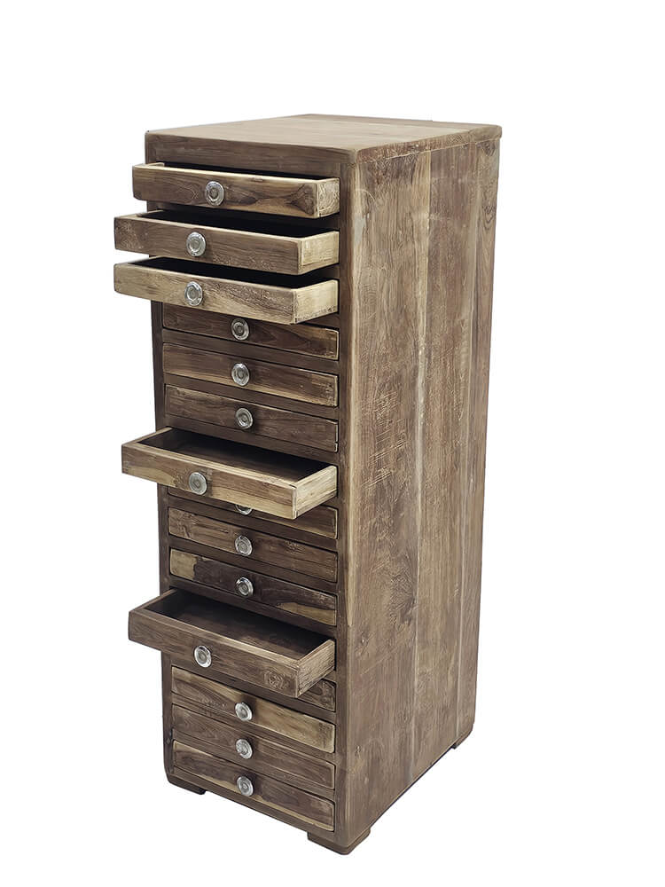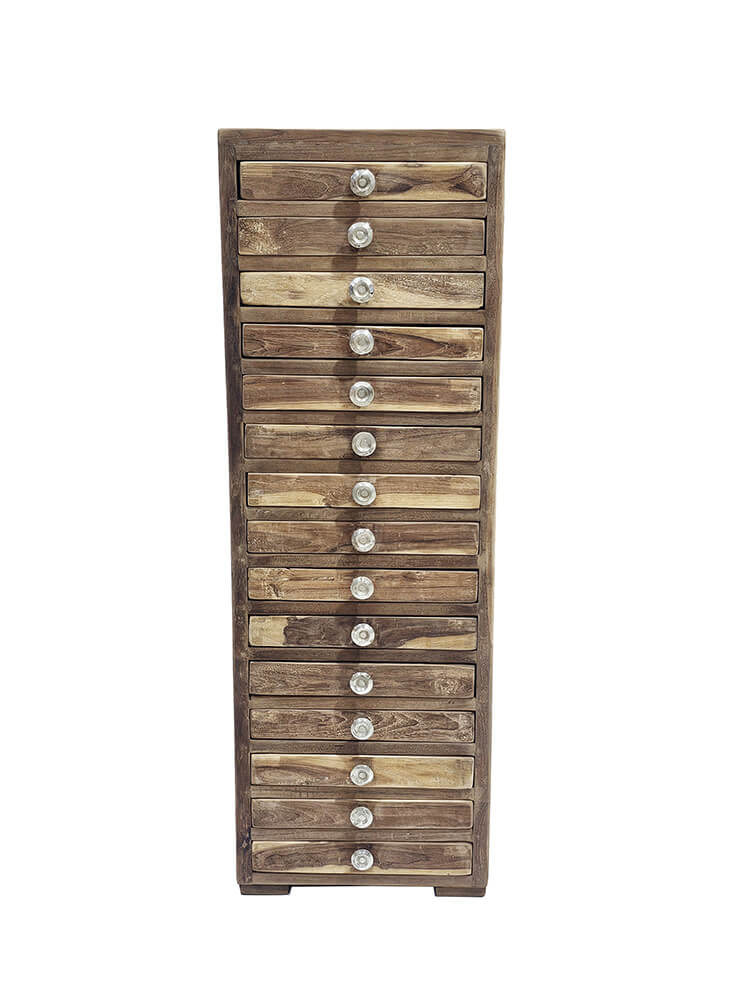 Denne unikke vintage kommode er fremstillet af genbrugstræ og rummer 15 praktiske skuffer, der giver masser af opbevaringsplads med et strejf af historie. Træets naturlige farvespil, patina og ujævnheder fortæller sin egen historie og gør hver kommode helt særlig. De små skuffer er perfekte til opbevaring af kontorartikler, smykker, bestik eller andre småting, du ønsker at have styr på – både i hjemmet, butikken eller caféindretningen. Kombinationen af rustikt genbrugstræ og de små metalgreb giver kommoden et autentisk udtryk med tydelige industrielle referencer. Et funktionelt og karakterfuldt møbel, der tilfører varme og personlighed til ethvert rum.