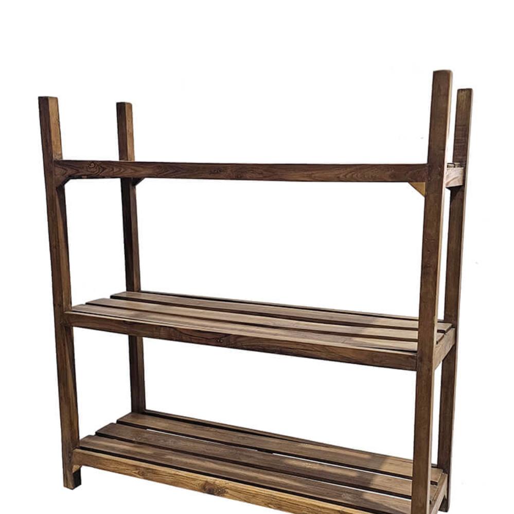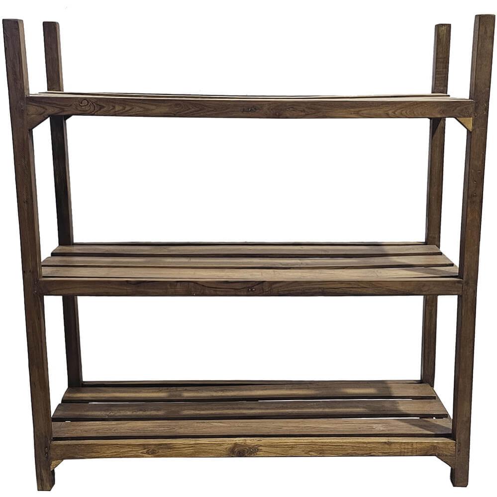 Denne gamle træreol udstråler rå charme og naturlig autenticitet. Reolen er fremstillet af genbrugstræ, hvor hver planke fortæller sin egen historie gennem unikke farvenuancer, årer og patina. Det enkle design med tre rummelige hylder gør den både funktionel og dekorativ. Reolen passer perfekt i mange typer indretning, lige fra det rustikke til det industrielle eller moderne rum, hvor den tilfører varme og karakter. Brug den til opbevaring af bøger, planter, køkkenudstyr eller som en smuk udstillingsreol i butikken eller caféen. Et møbel med et strejf af historie og håndværk.