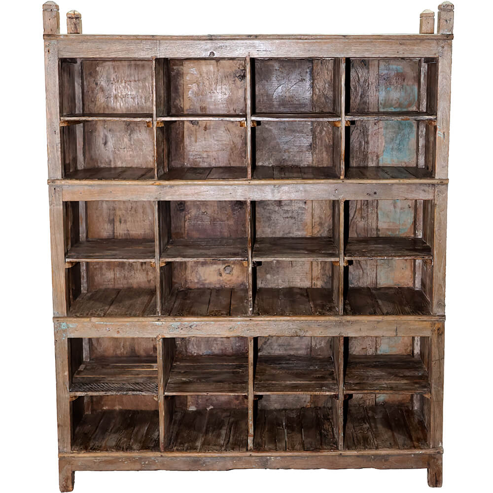 Denne gamle træreol med 24 rum er et møbel, der virkelig skiller sig ud. Det slidte træ, de ujævne overflader og de små farvespor giver den et råt, autentisk look, som man ikke kan genskabe. Det kommer kun med tid og brug. De mange rum gør reolen superpraktisk, uanset om du bruger den til opbevaring, display, vin, kreative projekter eller som et blikfang i entreen eller butikken. Den er robust, rummelig og fuld af karakter, så du får både funktion og dekorativ værdi i ét og samme møbel. En reol som denne er perfekt til dig, der elsker unikke fund og indretning med varme, patina og masser af personlighed.