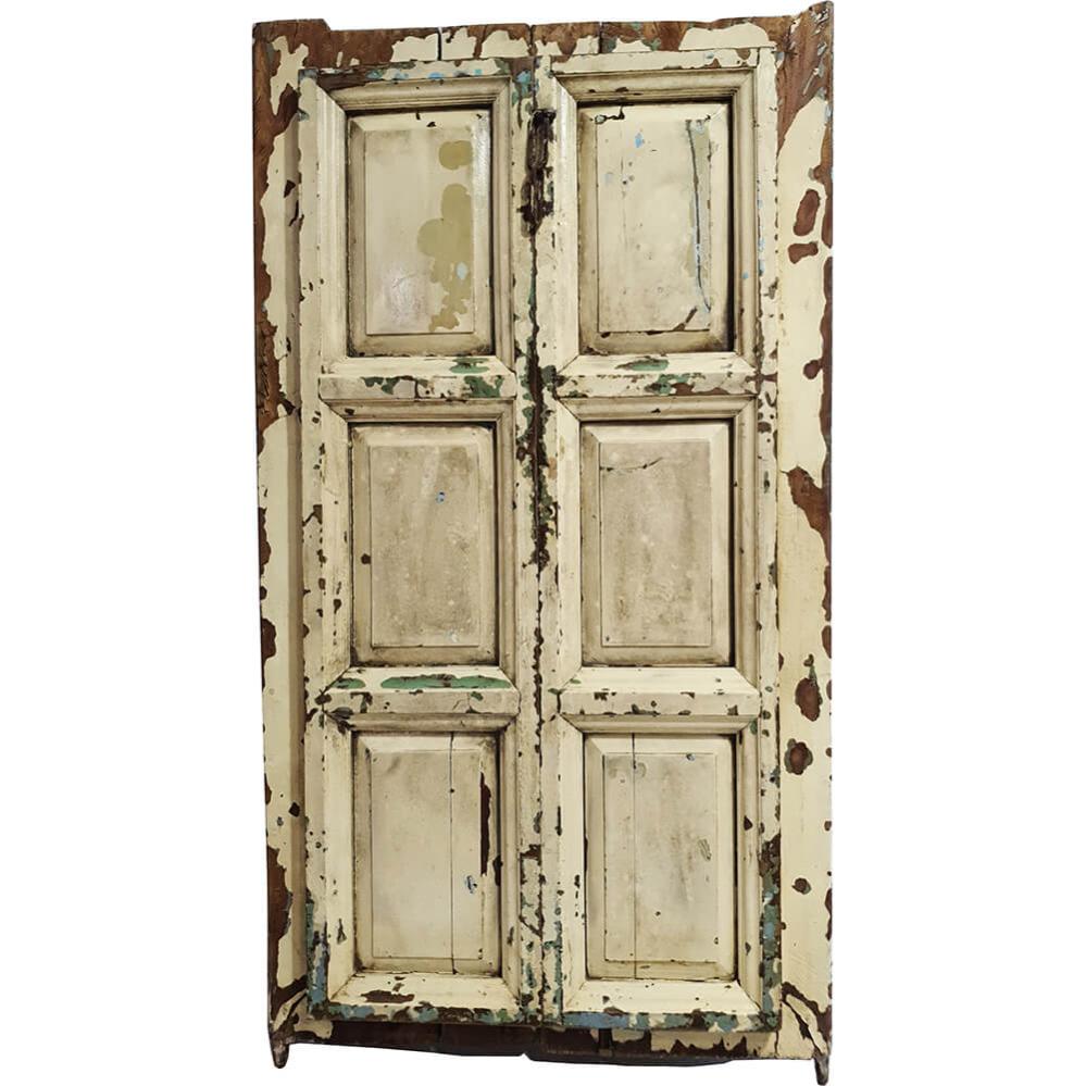 Denne smukke trædør i afdæmpet cremefarve har tydeligvis haft et langt og farverigt liv. Det afskallede malinglag afslører glimt af tidligere tider og kulører, og giver døren et udtryk, der nærmest ikke kan genskabes, - det kan kun slides til. Med sine klassiske fyldninger og rå patina kan døren bruges som en dekorativ detalje i både moderne og rustikke rum. Stil den op ad væggen, hæng den som vægkunst, eller lad den få nyt liv som en unik dør i et kreativt projekt. Hver ridse, hver skramme og hver malingplet er en del af dørens historie.
