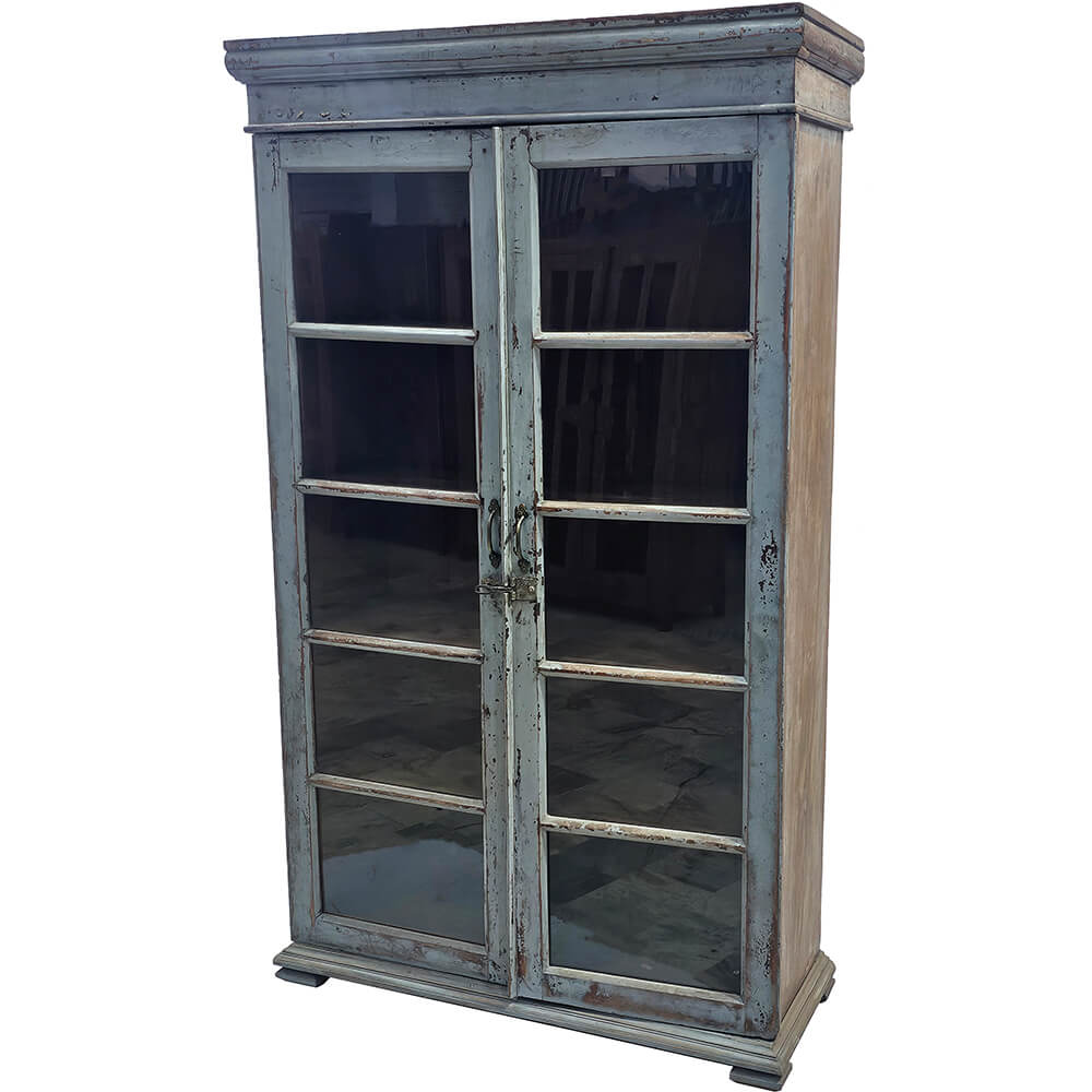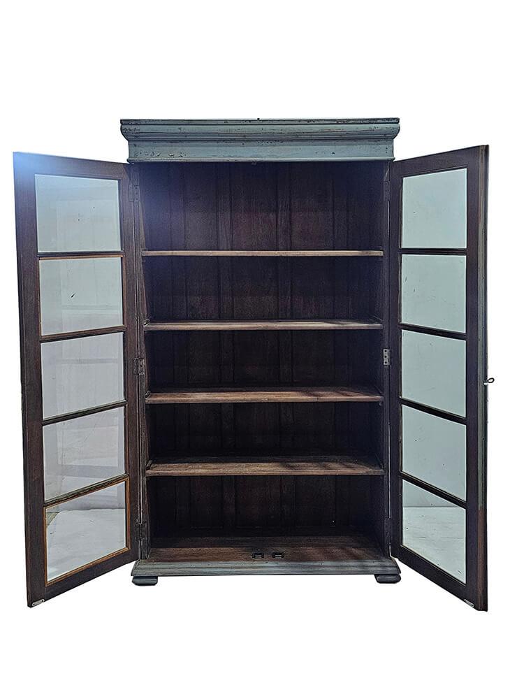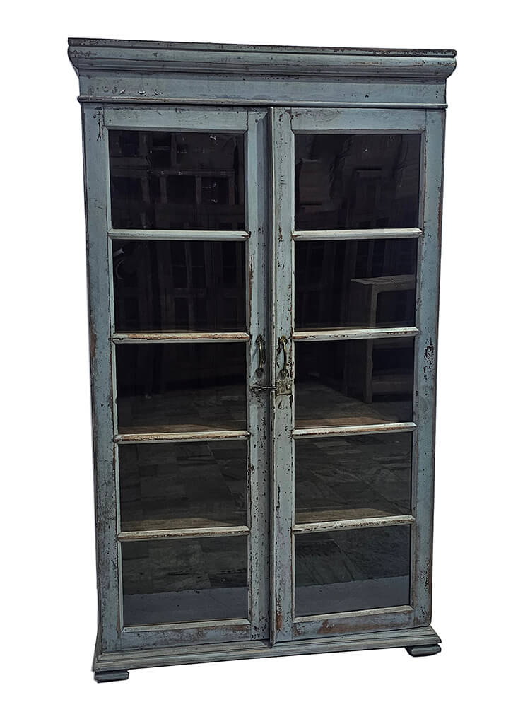 Dette gamle grå vitrineskab er et smukt og stemningsfuldt møbel med masser af patina og historie. Den afdæmpede grå farve kombineret med det mørke træ indvendigt giver skabet et roligt og elegant udtryk, som passer perfekt ind i både klassiske, rustikke og moderne hjem. Skabet har to glaslåger med fine sprosser, som giver et flot kig til indholdet og gør det ideelt til opbevaring og udstilling af service, glas, bøger eller dekorative genstande. Indvendigt er skabet indrettet med fem hylder, som giver god plads og mange anvendelsesmuligheder. Den originale overflade bærer præg af alder og brug, hvilket kun bidrager til skabets autentiske charme. Et karakterfuldt vitrineskab, der fungerer lige så godt i køkkenet eller stuen som i butik, café eller showroom.