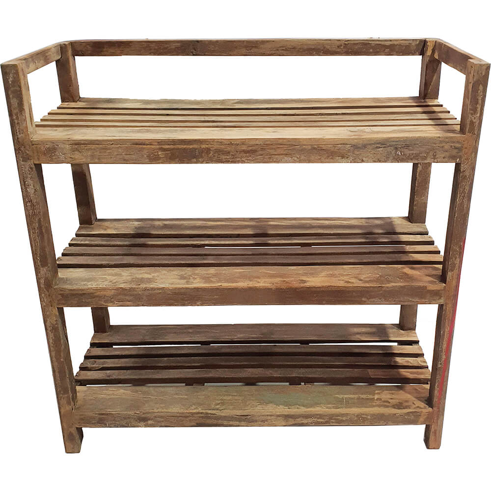 Denne lave træreol med tre lamelhylder er et skønt eksempel på, hvordan noget helt enkelt kan få masser af karakter. Reolen er lavet af træ, og hver hylde har sit eget naturlige spil i farve og patina, hvilket præcis er dét, der giver den charme og personlighed. Den åbne konstruktion gør den super anvendelig i både entreen, stuen, køkkenet eller som ekstra opbevaring i et butiksmiljø. Her kan du let stille sko, plaider, kurve, planter eller alt det, du gerne vil have lige ved hånden. En praktisk, let og ærlig reol, der tilfører varme og et rustikt touch til rummet.