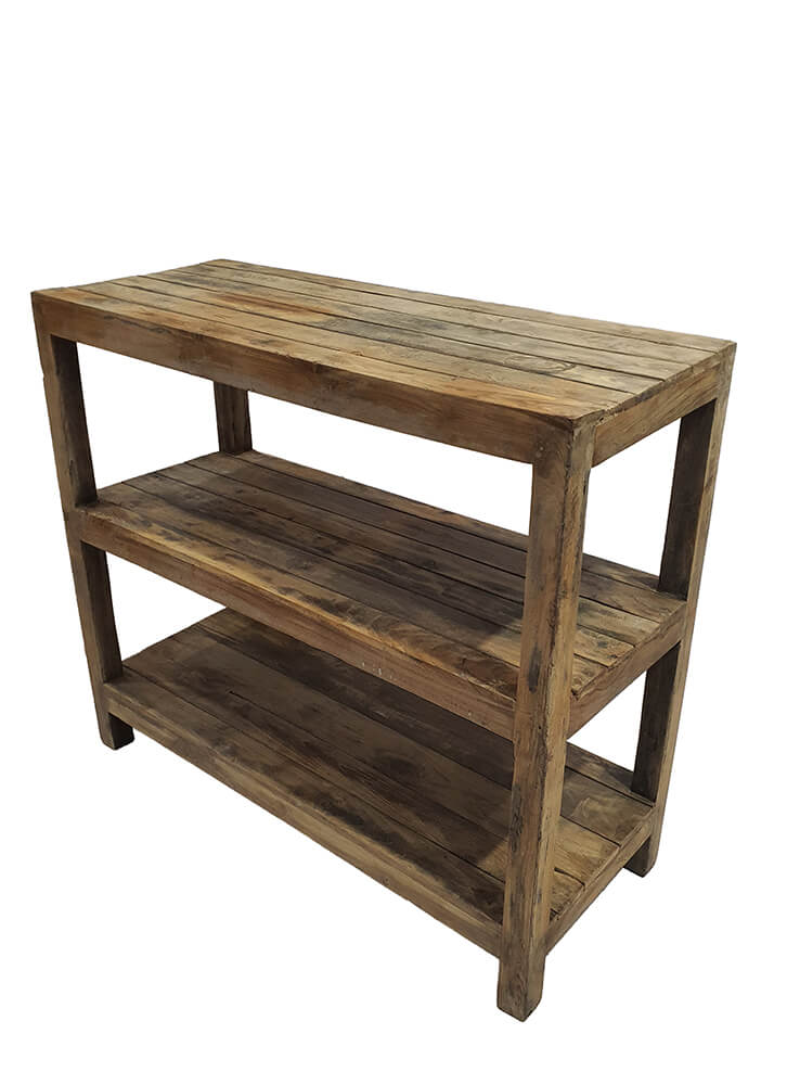 Denne lave træreol er et enkelt og praktisk møbel med masser af varme og karakter. Den er lavet i solidt træ, hvor åretegninger og naturlige spor giver et autentisk, rustikt udtryk. Reolen har tre rummelige hylder, som gør den oplagt til alt fra opbevaring i entré og køkken til styling i stuen eller butikken. Den åbne konstruktion giver et let og roligt look, samtidig med at den tilbyder god plads til både kurve, keramik, bøger eller planter. Et alsidigt møbel, der er nemt at placere, og som tilføjer et naturligt, varmt element i enhver indretning.