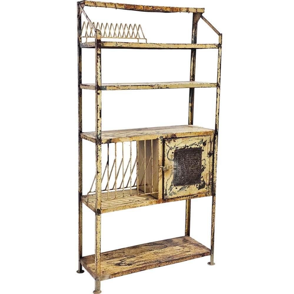 Denne rustikke køkkenreol i en skøn gul nuance er både praktisk og charmerende. Reolen har flere hylder til opbevaring af køkkengrej, madvarer eller dekorationer, samt et skab med mesh-dør, der tilføjer et råt og industrielt præg. Den indbyggede tallerkenholder giver et funktionelt touch, mens den slidte patina og de brugte detaljer bringer en autentisk vintage-stemning til dit køkken eller spisestue. Perfekt til dig, der ønsker et møbel med karakter og historie, der samtidig kan holde styr på det hele.