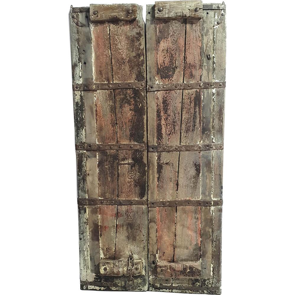 Denne kraftige gamle trædør er ikke bange for at vise, hvor den kommer fra. Med tydelige spor af slid, vejrpåvirkning og årtiers brug, står den som et vidnesbyrd om solidt håndværk og ægte patina. Døren er opbygget af lodrette planker, holdt sammen af vandrette og diagonale træstivere og kraftige metalbeslag med nitter. De grove jernlåse og hængsler giver døren et råt og autentisk udtryk, der næsten kalder på historiefortælling. Her er ikke pynt og pjat, kun ærlig konstruktion og et råt ujævnt træværk i nuancer af brun, rødlig og grå. Perfekt som dekorativ vægpanel, som baggrund i en butik eller som samtalestarter i et hjem, hvor det rustikke må spille hovedrollen. En dør med karakter og kant, lige som vi kan lide det.