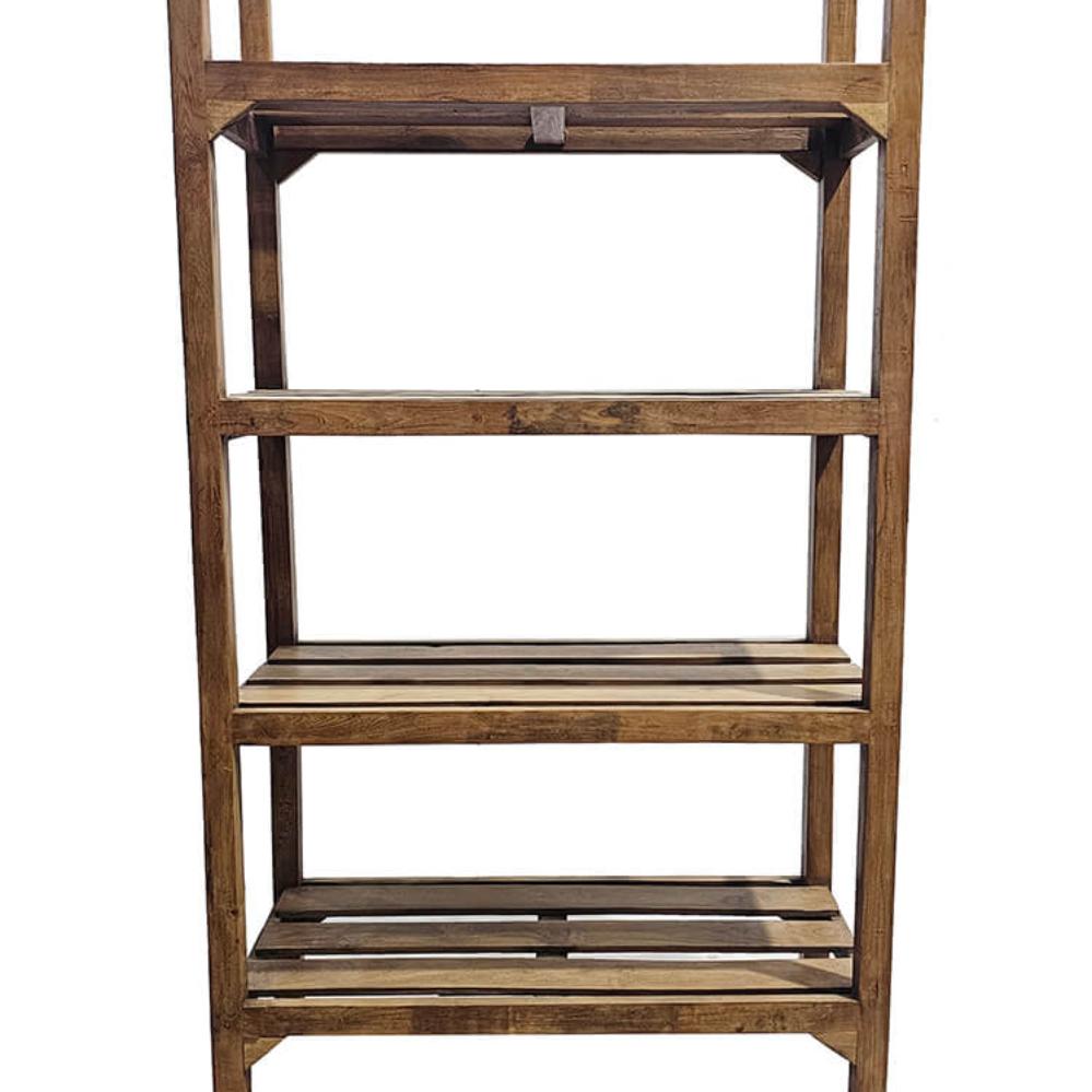 Denne træreol er ikke ny. Og det er netop det, der gør den helt særlig. Reolen er lavet af massivt teaktræ og står som original; brugt, ærlig og fuld af liv. Med sit klassiske, enkle design og lamelhylder i smukt patineret træ har den både funktion og personlighed. Reolen har tidligere haft et arbejdsliv, og det ses i de små mærker og variationer i træet. Her får du et stykke møbelhistorie med karakter og varme, ikke noget fabriksnyt og poleret. Perfekt som displayreol i butik, til opbevaring i køkkenet eller som et rustikt indslag i caféen. En teaktræsreol med kant, autenticitet og en fortid, der giver mening i nutiden.