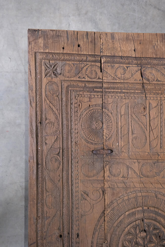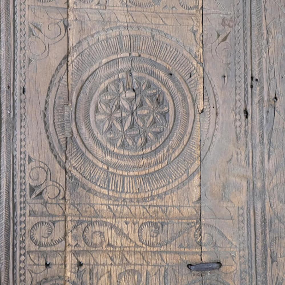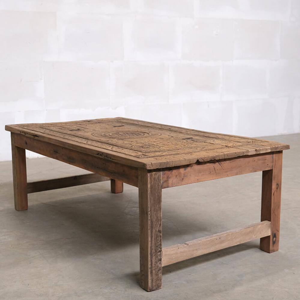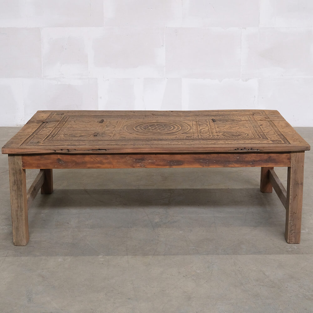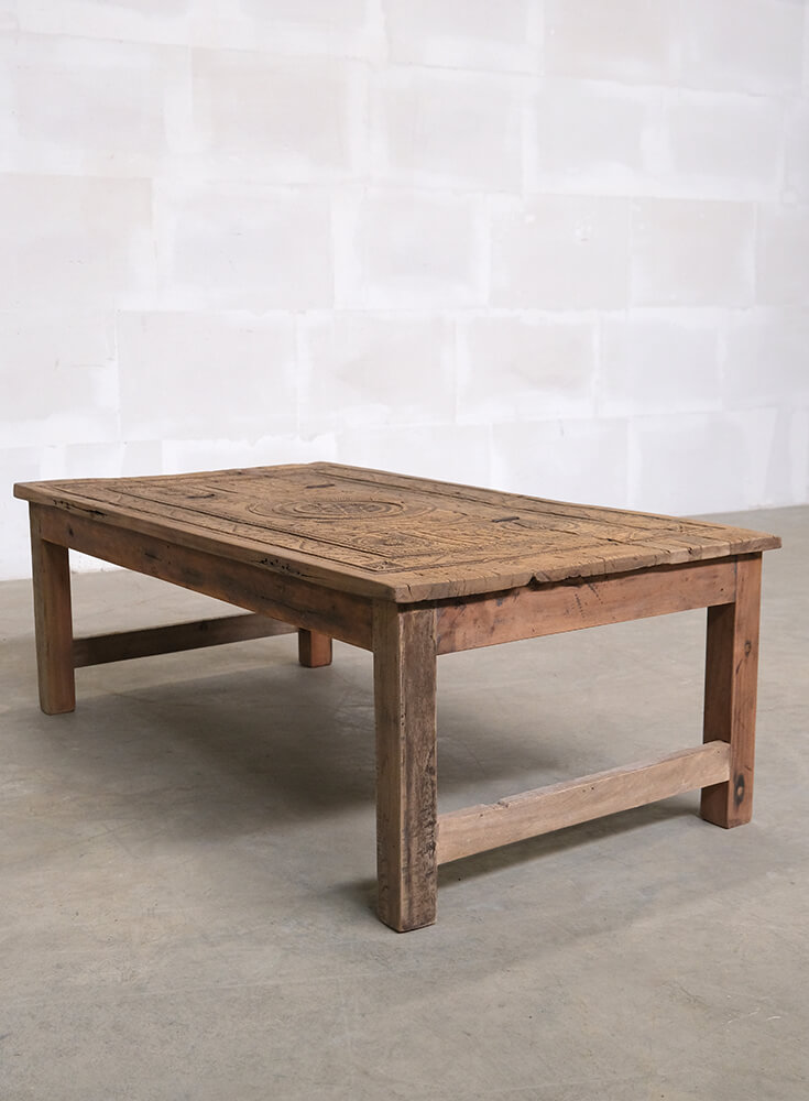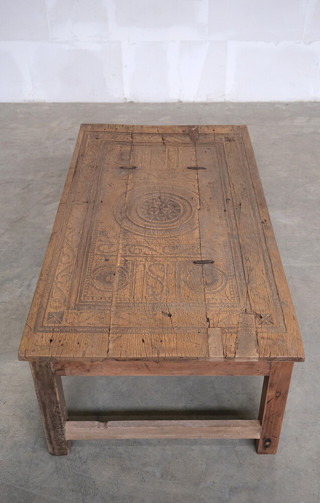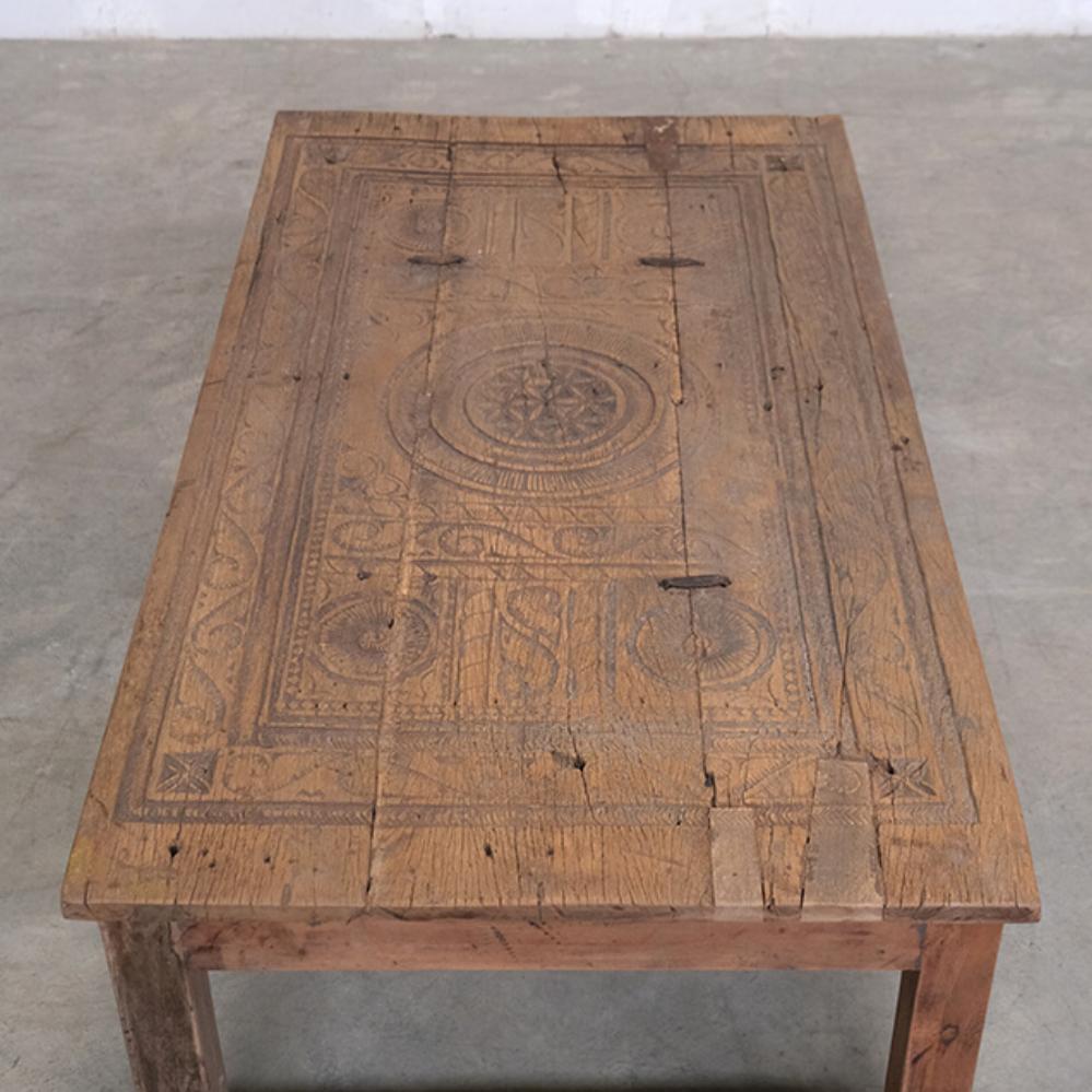 Dette unikke sofabord er et stykke rustikt og autentisk håndværk. Bordpladen er udsmykket med smukke udskæringer, som giver møblet en karakterfuld fremtoning. Træet har den skønneste naturlige patina og brugsspor, der fortæller historier fra bordets tidligere liv. Det robuste design og de håndværksmæssige detaljer gør bordet ideelt til indretninger, der søger charme og autenticitet. Perfekt som samlingspunkt i stuen eller som et dekorativt element i en indretning, der værdsætter vintage og unik karakter.