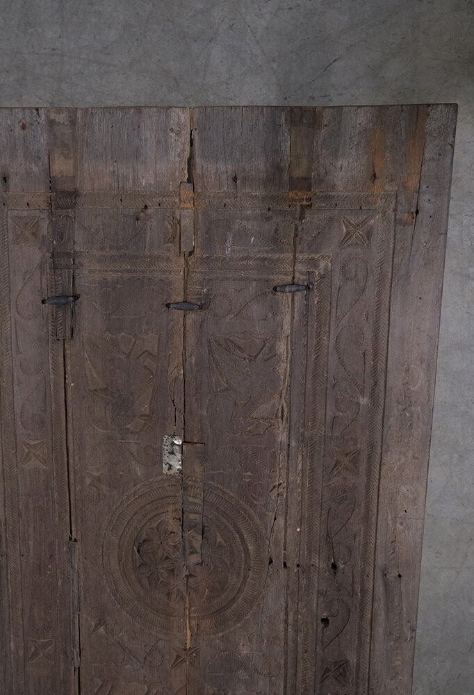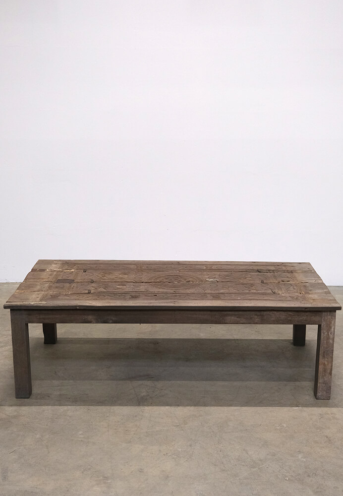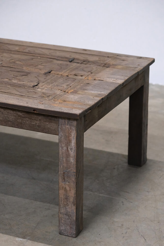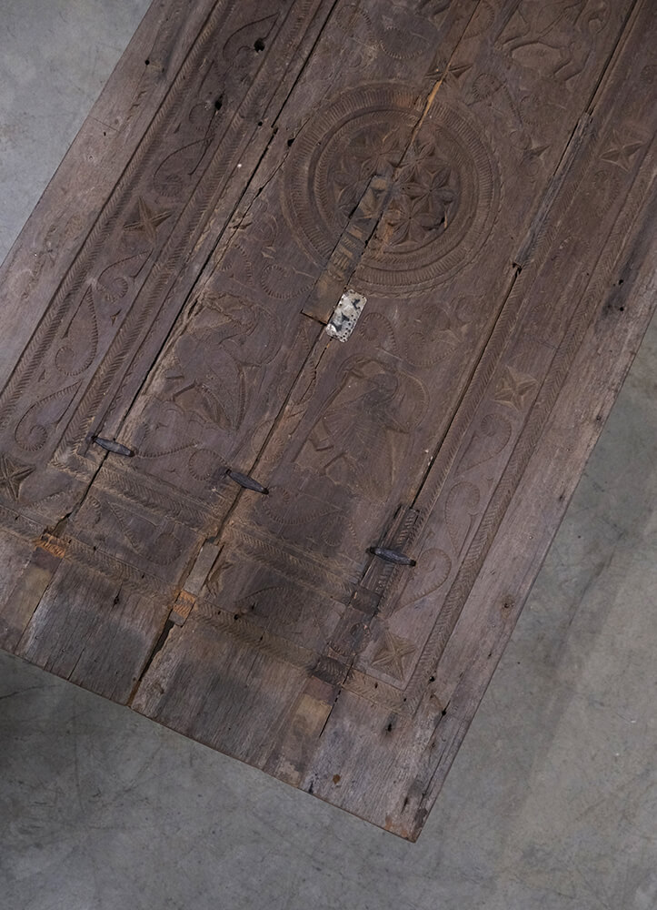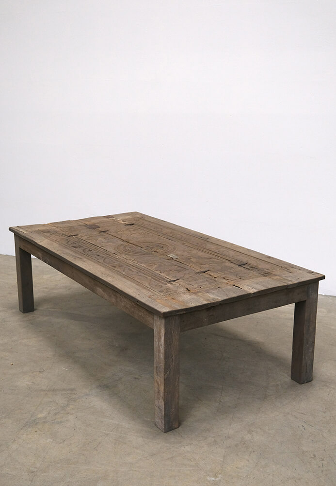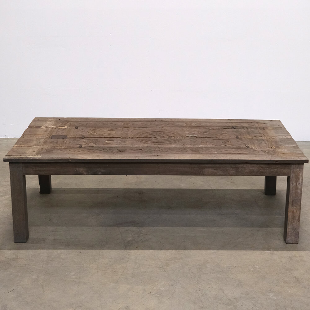 Dette sofabord er skabt af en gammel, håndskåret dør og er et helt unikt møbel med masser af historie og karakter. Bordpladen bærer tydelige spor fra sit tidligere liv – udskæringer, samlinger, revner og patina, som tilsammen giver bordet et råt og autentisk udtryk. Hver detalje fortæller sin egen historie, og netop derfor findes der kun dette ene eksemplar. Den solide trædør er nænsomt omdannet til et funktionelt sofabord, hvor det originale håndværk er bevaret og fremhævet. Kombinationen af den dekorative bordplade og de enkle ben skaber en fin balance mellem det rustikke og det rolige. Et særligt sofabord, der fungerer som et naturligt blikfang i stuen og passer perfekt til dig, der ønsker et møbel med sjæl og personlighed.