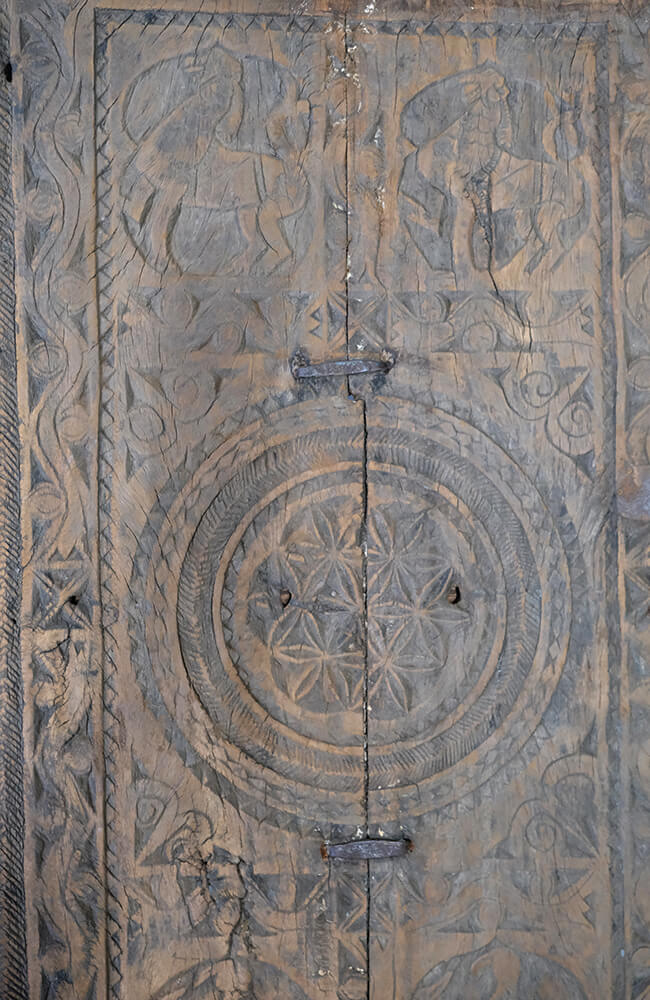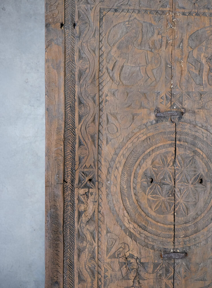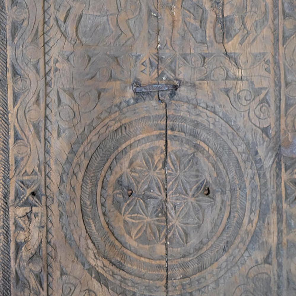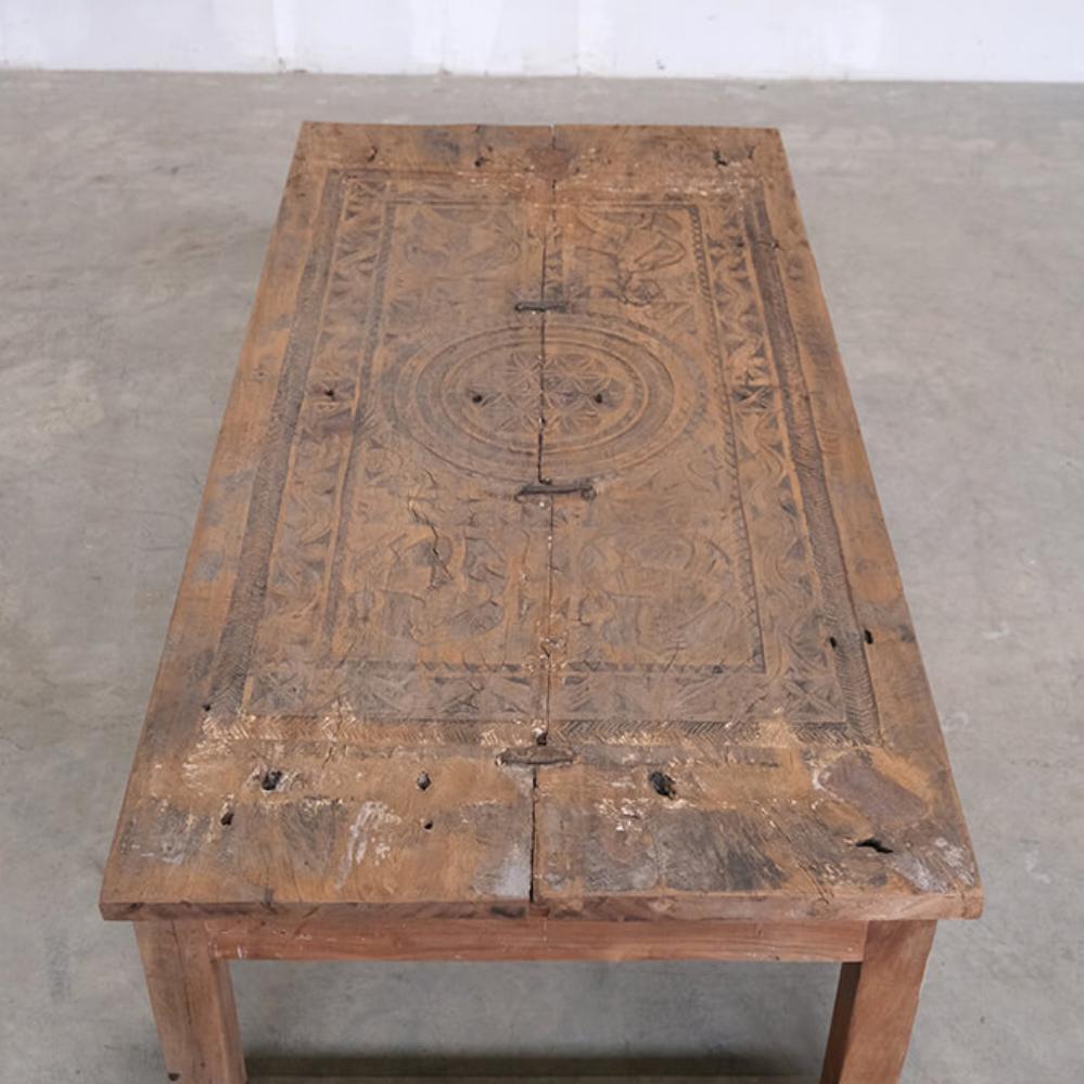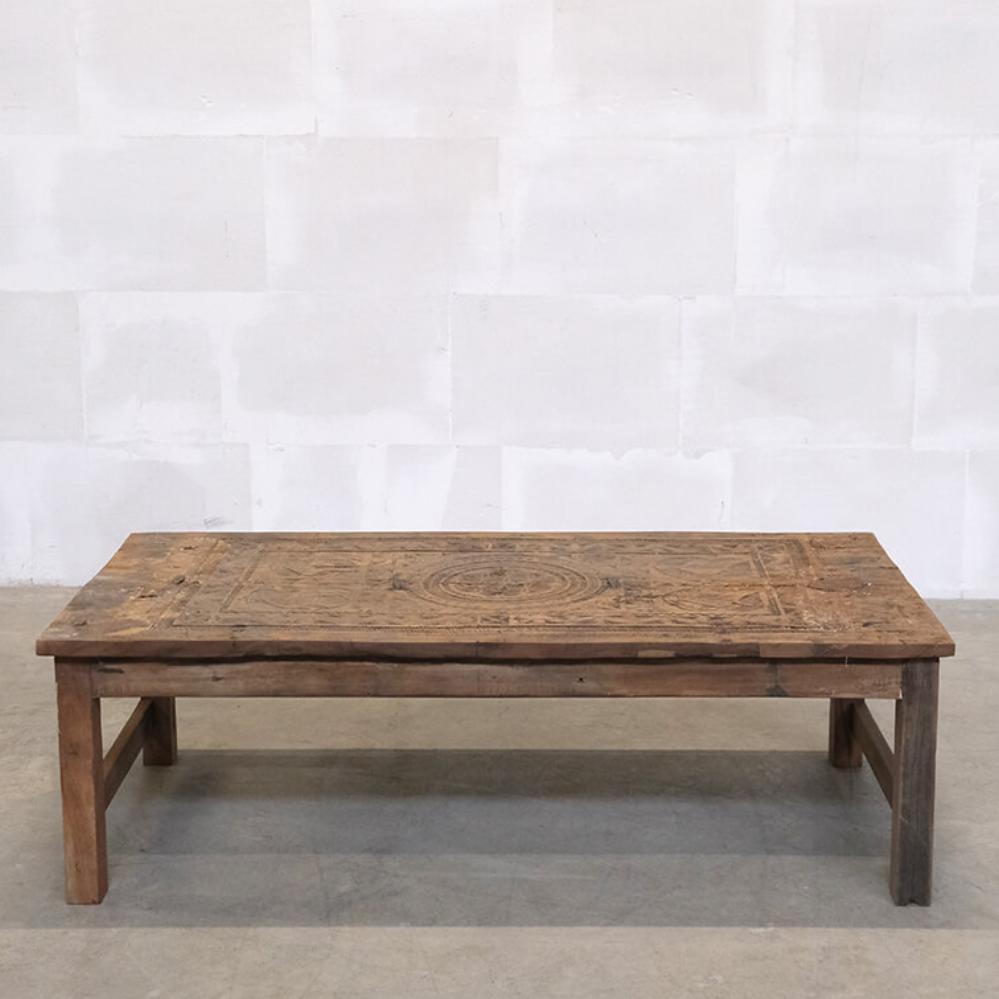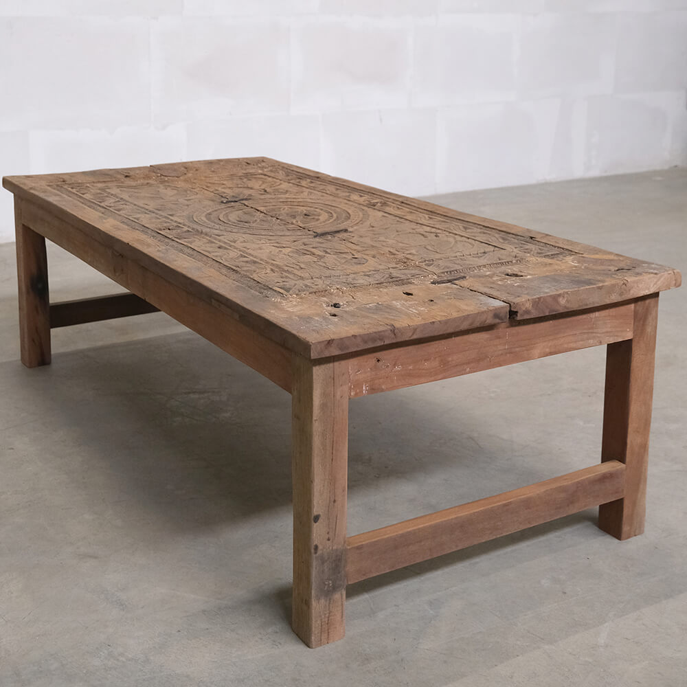 Dette unikke sofabord i træ har en rustik og autentisk charme, understreget af den smukke bordplade. Træet bærer tydelige spor af tidens tand med naturlig patina og slidmærker, som giver bordet en helt særlig karakter. De fine udskæringer på bordpladen tilføjer en ekstra dimension og gør det til et kunstnerisk og detaljeret møbel. Bordets størrelse er ideelt, hvis man ønsker et lidt større sofabord. Med sin robuste konstruktion og de synlige brugsspor er dette bord perfekt til indretninger, der værdsætter rå materialer og vintage-stil. Et enestående møbel, der tilføjer både sjæl og stemning til rummet.