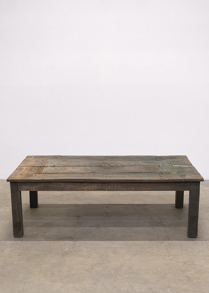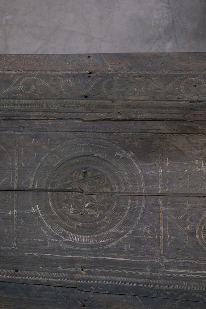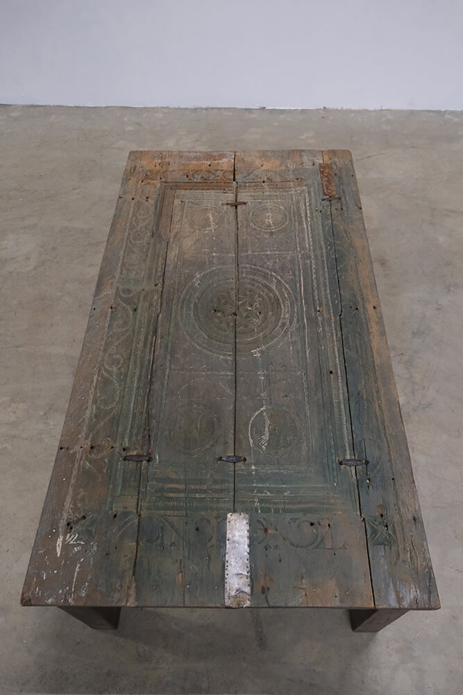 Dette unikke sofabord i træ har en rustik og autentisk charme, understreget af den smukke bordplade. Træet bærer tydelige spor af tidens tand med naturlig patina og slidmærker, som giver bordet en helt særlig karakter. De fine udskæringer på bordpladen tilføjer en ekstra dimension og gør det til et kunstnerisk og detaljeret møbel. Bordets størrelse er ideelt, hvis man ønsker et lidt større sofabord. Med sin robuste konstruktion og de synlige brugsspor er dette bord perfekt til indretninger, der værdsætter rå materialer og vintage-stil. Et enestående møbel, der tilføjer både sjæl og stemning til rummet.