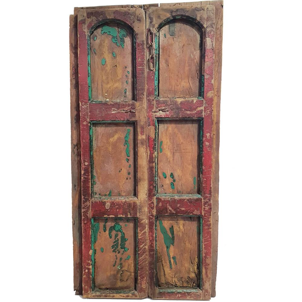 Denne fine, gamle trædør oser af historie og charme. De buede fyldninger og markante trærammer er dækket af sporadiske rester af rød og grøn maling, der giver døren en levende og rustik karakter. Farverne trænger igennem det slidte træ på finurlig vis og fortæller deres egen historie om mange års brug. Den rå struktur og ujævne overflade giver døren et autentisk og ærligt udtryk. Her er ikke noget poleret facade, men ægte personlighed og håndværk, der står stærkt, både alene og som en del af en indretning. Brug den som vægdekoration, sengegavl eller statement-piece i din butik eller bolig. Døren behøver ikke gøre sig til. Den har allerede masser af karakter.