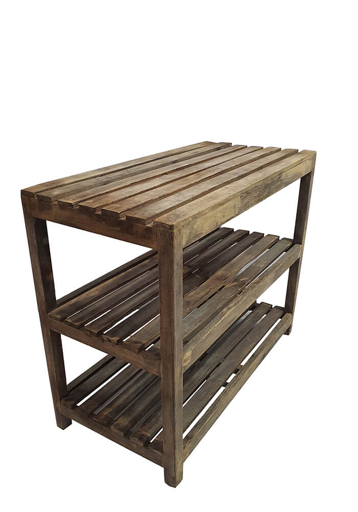Denne lave træreol med tre lamelhylder er perfekt til dig, der elsker møbler med et råt og levende udtryk. Reolen er lavet af træ, hvilket betyder, at farve, patina og slidspor varierer fra hylde til hylde og giver møblet en helt naturlig charme. Den åbne konstruktion gør den super anvendelig. Brug den i entreen til sko, i køkkenet til kurve og grej, i stuen til magasiner og planter eller i butikken til udstilling af varer. Et praktisk og let møbel, der tilfører varme og karakter, uanset hvor du placerer det.