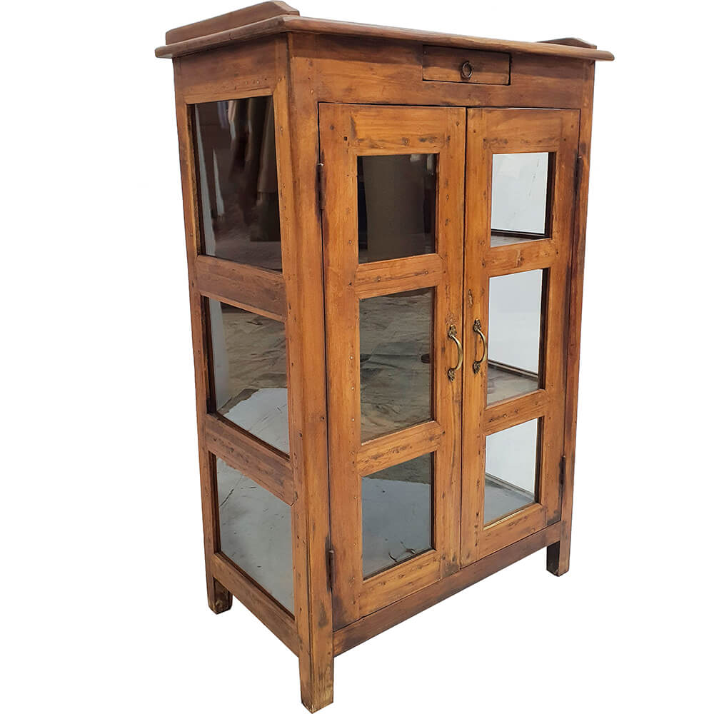 Denne smukke gamle vitrine er et møbel med masser af personlighed og charme. De mange glasfelter giver et let og luftigt udtryk, samtidig med at du får et flot kig ind til det, du vælger at stille på hylderne. Perfekt til alt fra keramik og glas til bøger, nips og små samlinger. Træet har den helt rigtige patina og slid, mærker og farvenuancer, der fortæller sin egen historie og gør denne vitrine helt unik. Øverst finder du en lille skuffe, der er ideel til småting, du gerne vil have lige ved hånden. Et karakterfuldt møbel, der både fungerer i stuen, køkkenet eller din butik, og som giver rummet varme og et strejf af vintage atmosfære.