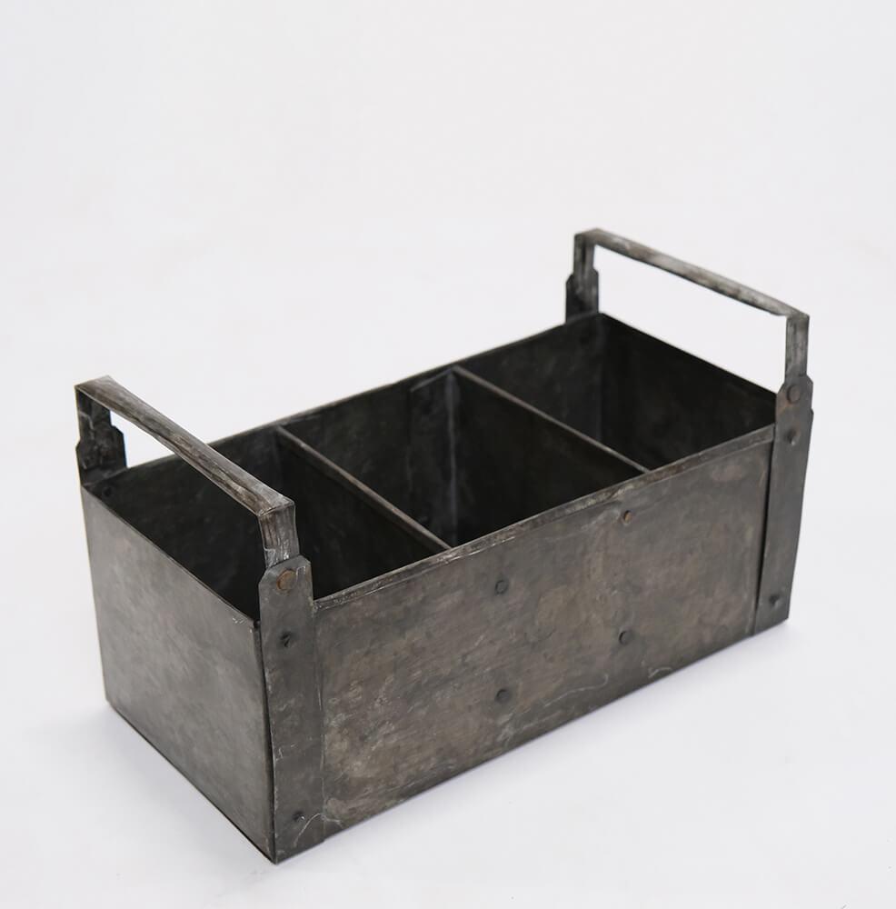 Flot og rå kasse med 3 rum og 2 håndtag. Denne lille kasse har rigtig mange anvendelsesmuligheder. Få styr på alle dine småting eller brug den til værktøj, strikketøj, krydderurter, olier eller på børneværelset til farveblyanter og blokke. Når den bliver overflødelig et sted, kan du bruge den et andet sted til opbevaring og i din indretning.