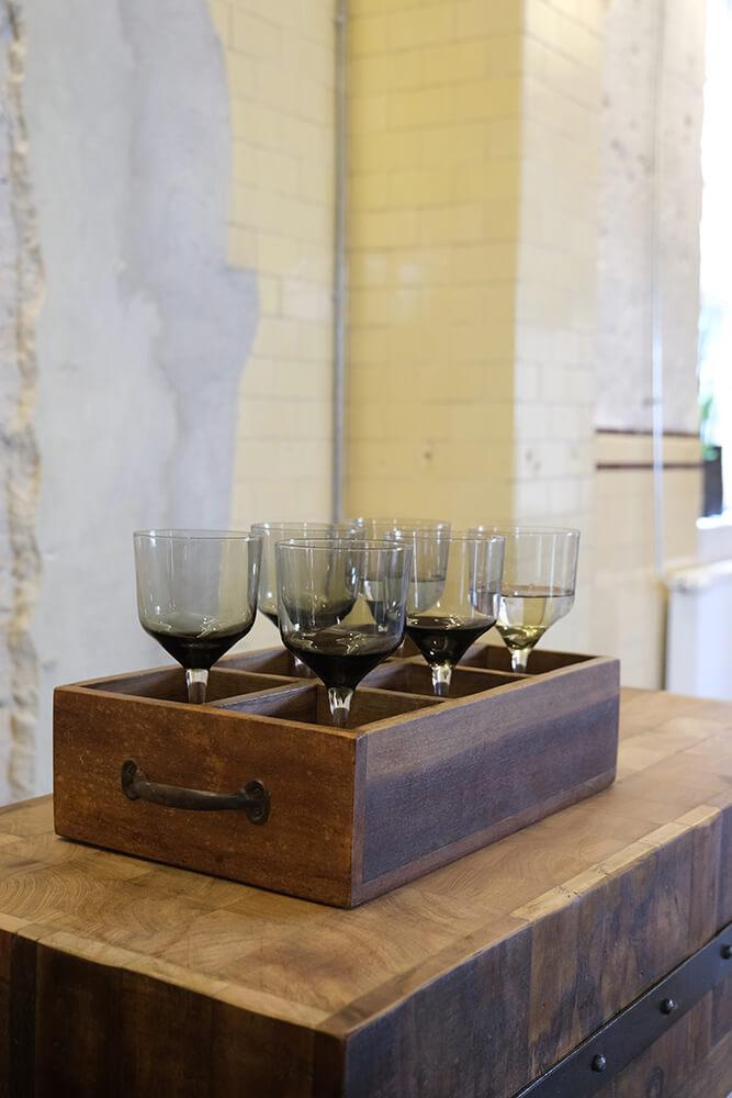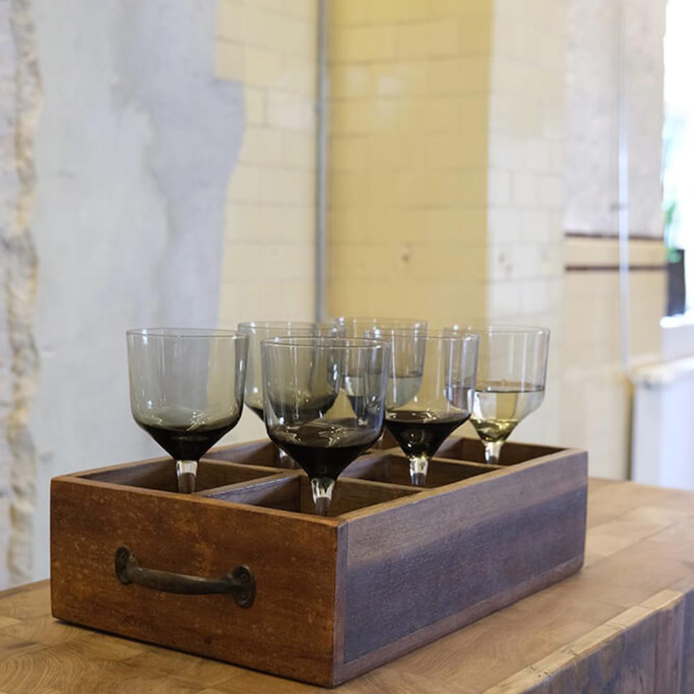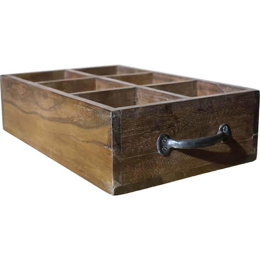 Denne robuste trækasse med seks praktiske rum og to håndtag i metal er både funktionel og dekorativ. Trækassen er lavet af genanvendt træ, og har en naturlig patina og et autentisk, rustikt udtryk. Kassen er perfekt til opbevaring af småting, olier eller kontorartikler og kan nemt flyttes rundt takket være håndtagene. Hvert rum giver god organisering og tilføjer samtidig et strejf af rå charme til din indretning, hvad end det er i køkkenet, kontoret eller restauranten.