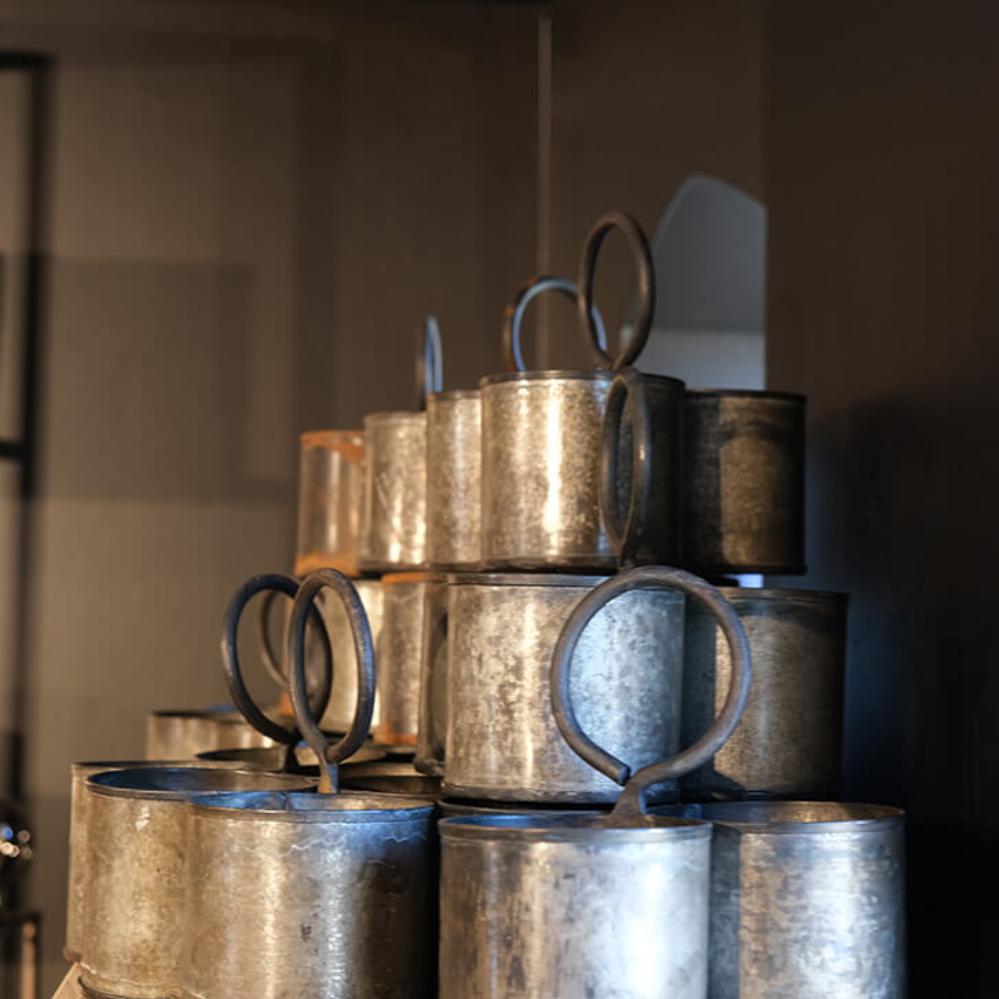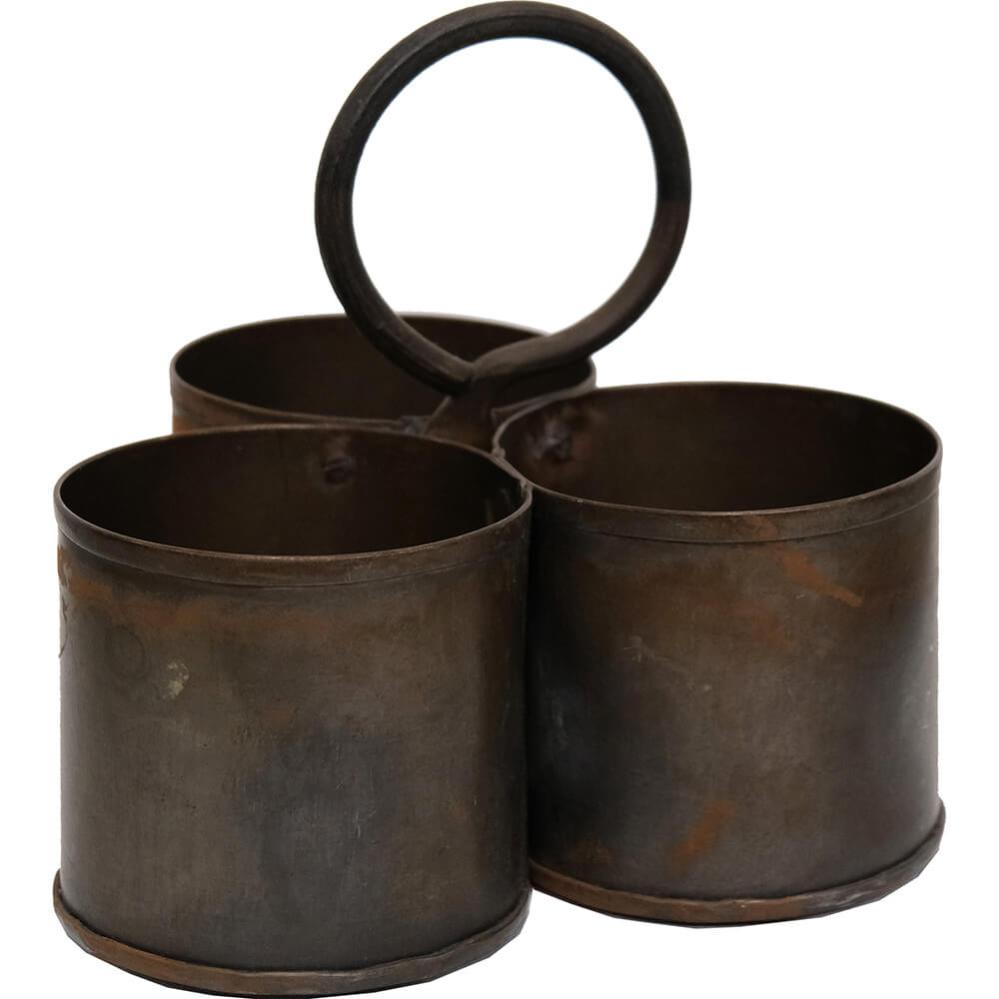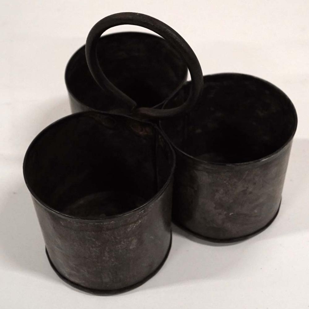 3 sammensatte bøtter i jern med hank. Enkelt dekorativ og rustik bøtte/potte. Bøtten har et utal af anvendelsesmuligheder. Du kan bruge den i køkkenet til bestik, krydderurter, kaffekapsler og køkkentøj. På kontoret kan du bruge den til opbevaring af dine skriveredskaber og mindre kontorartikler. I badeværelset kan du bruge bøtten til opbevaring af hårbørster, tandbørster, makeup eller hårelastikker. I dit orangeri vil disse flotte potter være perfekte til alle mulige former for planter. Du skal være opmærksom på, at potten ikke er vandtæt, hvorfor du skal fore den med plastik eller stille en lille vandtæt indsats i den. Brug dem i din café til bestik, servietter og olier. Bemærk at den angivne højde er inkl. ophæng. Selve bøtterne er 9 cm høje og 10 cm i diameter.