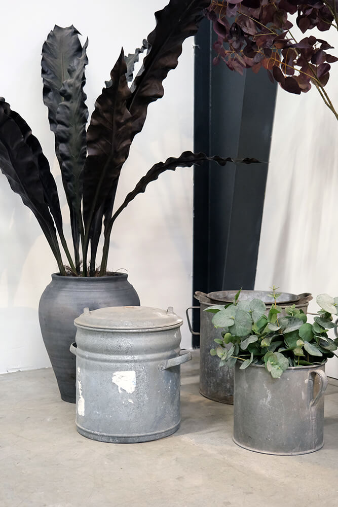 Charmerende gamle zinkspande med praktiske sidehåndtag, der gør dem nemme at flytte rundt på. Spandene varierer en smule i højde, bredde og udtryk, og netop de små forskelle giver dem deres helt særlige karakter. De rå overflader med smukke spor af brug og patina fortæller en historie om tid og slid, og gør spandene oplagte som dekorative elementer. Brug dem eksempelvis som plantekrukker, til skraldespand, til opbevaring eller i en butiksindretning, hvor de tilfører en autentisk, industriel stemning.