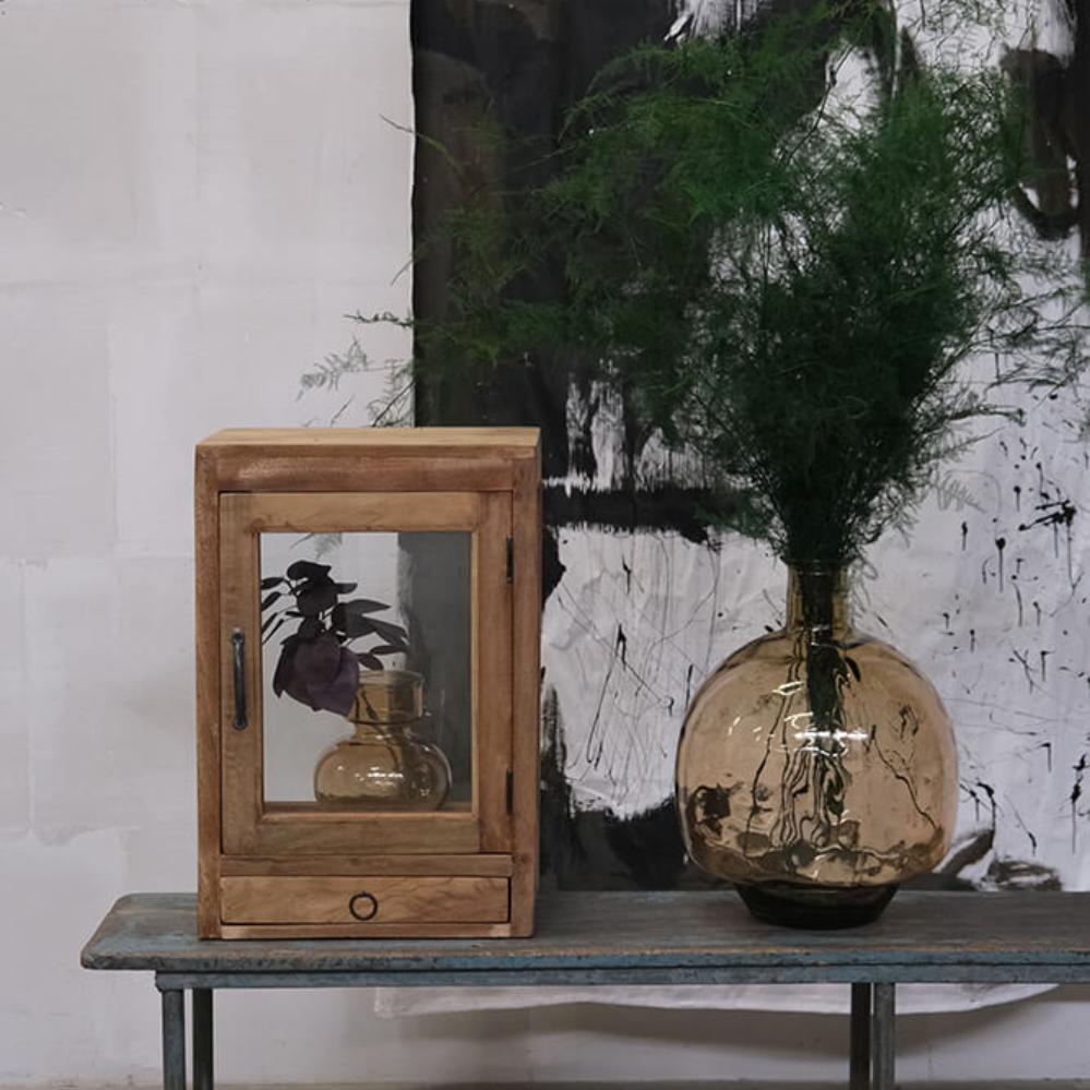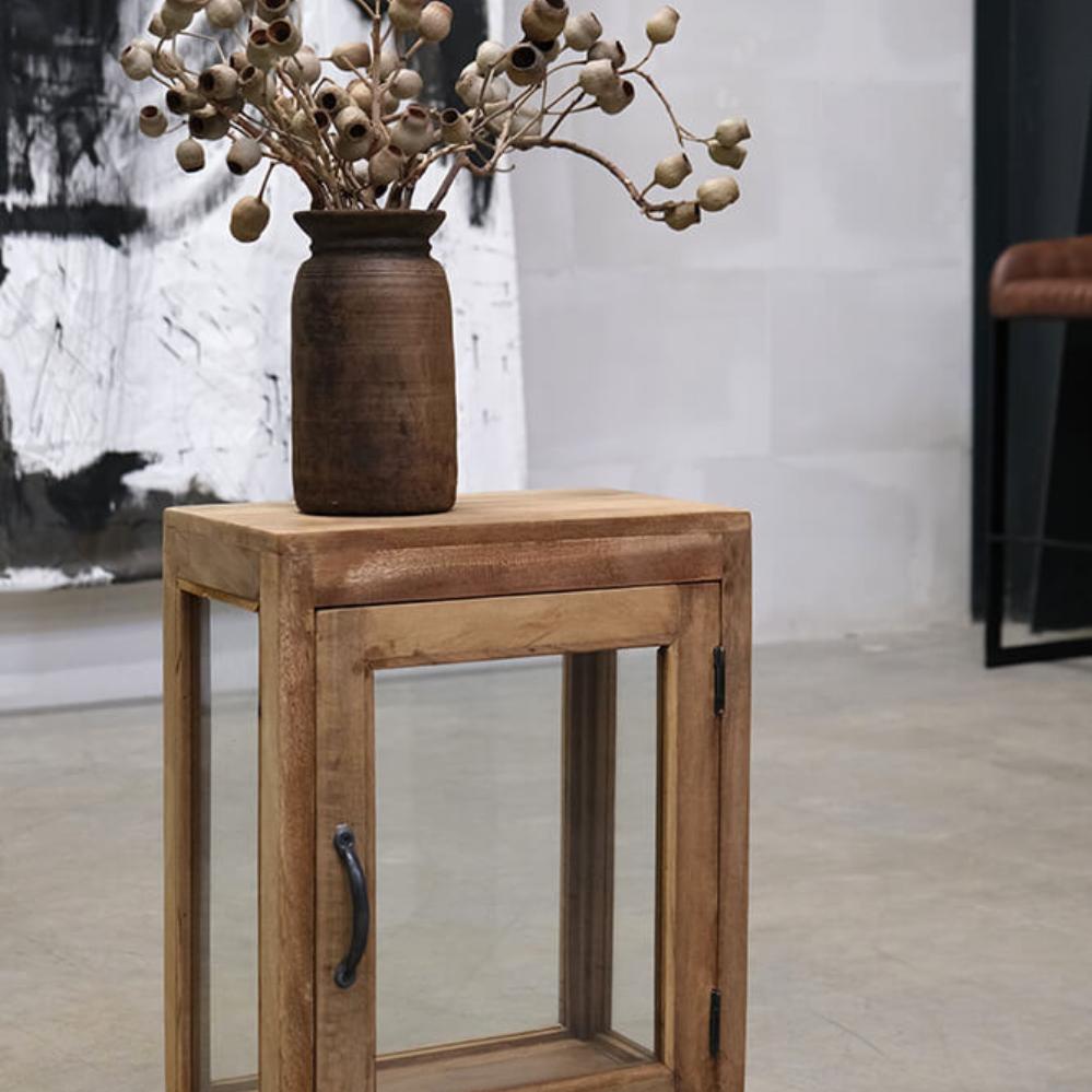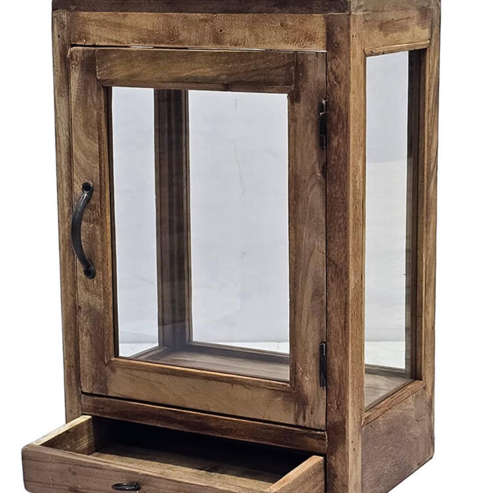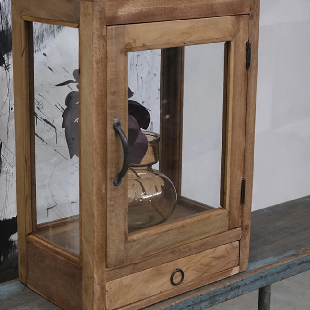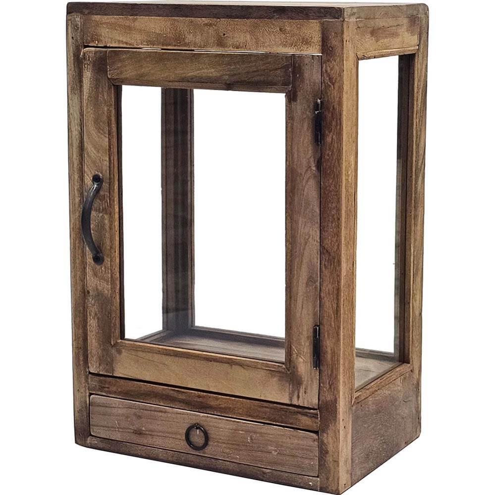 Super skøn lille glasmontre med en smuk patina. Glasmontren er fremstillet i genanvendt træ og har en glaslåge, samt en lille skuffe nederst til de ting du gerne vil have gemt væk. Brug den smukke glasmontre i din butik til udstilling af smykker, ure eller andre små nips. Du kan også bruge den i dit hjem som et skønt møbel til udstilling af dine yndlingspyntegenstande.