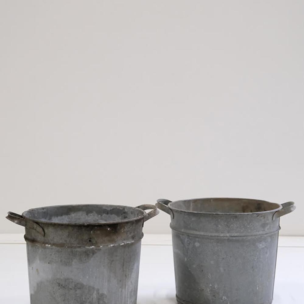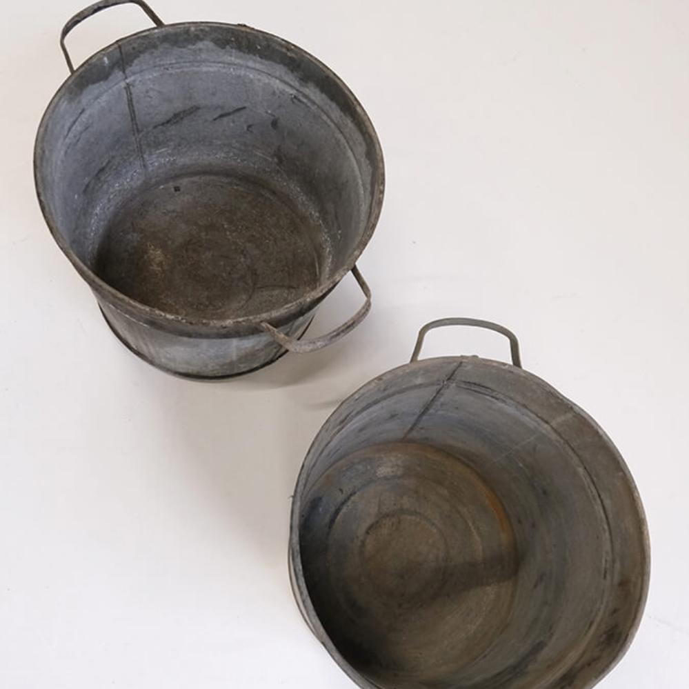 Disse gamle zinkspande har masser af patina og historie i overfladen. Spandene har de karakteristiske ører i siderne, der gør dem nemme at flytte rundt på, og de varierer en smule i størrelse og form, hvilket giver et levende og autentisk udtryk. Brug dem som rå dekorationselementer, til planter, til skraldespand, til opbevaring eller som en del af en butiksudstilling, hvor de tilfører et strejf af industrielt vintage-look. Hver spand har sit helt eget særpræg, men tilsammen skaber de et fint, harmonisk udtryk.