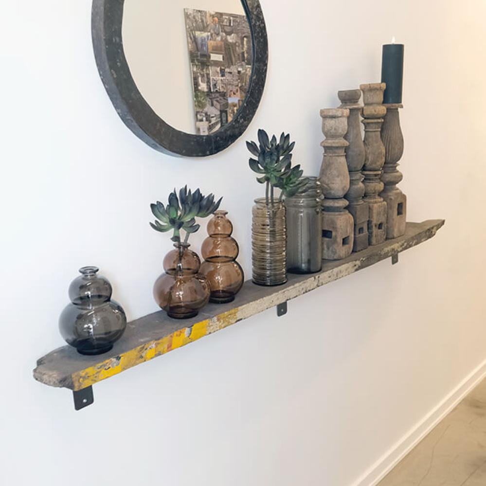 Denne rustikke hylde er lavet af genanvendt træ, der giver den masser af patina og charme. Hylden måler cirka 2 meter i længden og har et robust og industrielt look, hvilket gør den perfekt til at tilføje karakter og autenticitet til et rum. Træoverfladen fremstår rå og ubehandlet og bærer tydelige tegn på slitage og historie. Den simple konstruktion med metalbeslag understøtter hyldens solide og rustikke udtryk, og hylden kan bruges både i hjemmet, restauranter eller butikker til at skabe en dekorativ opbevaringsløsning med kant og sjæl.