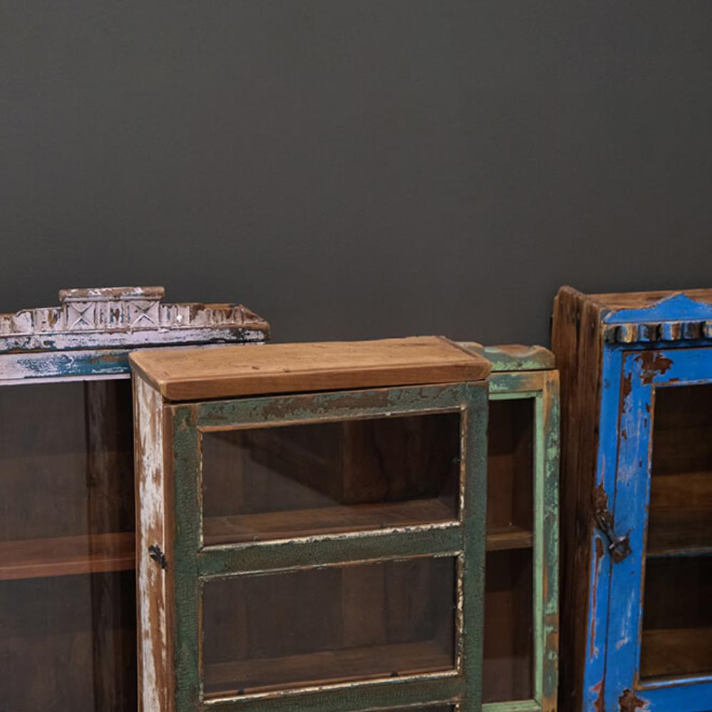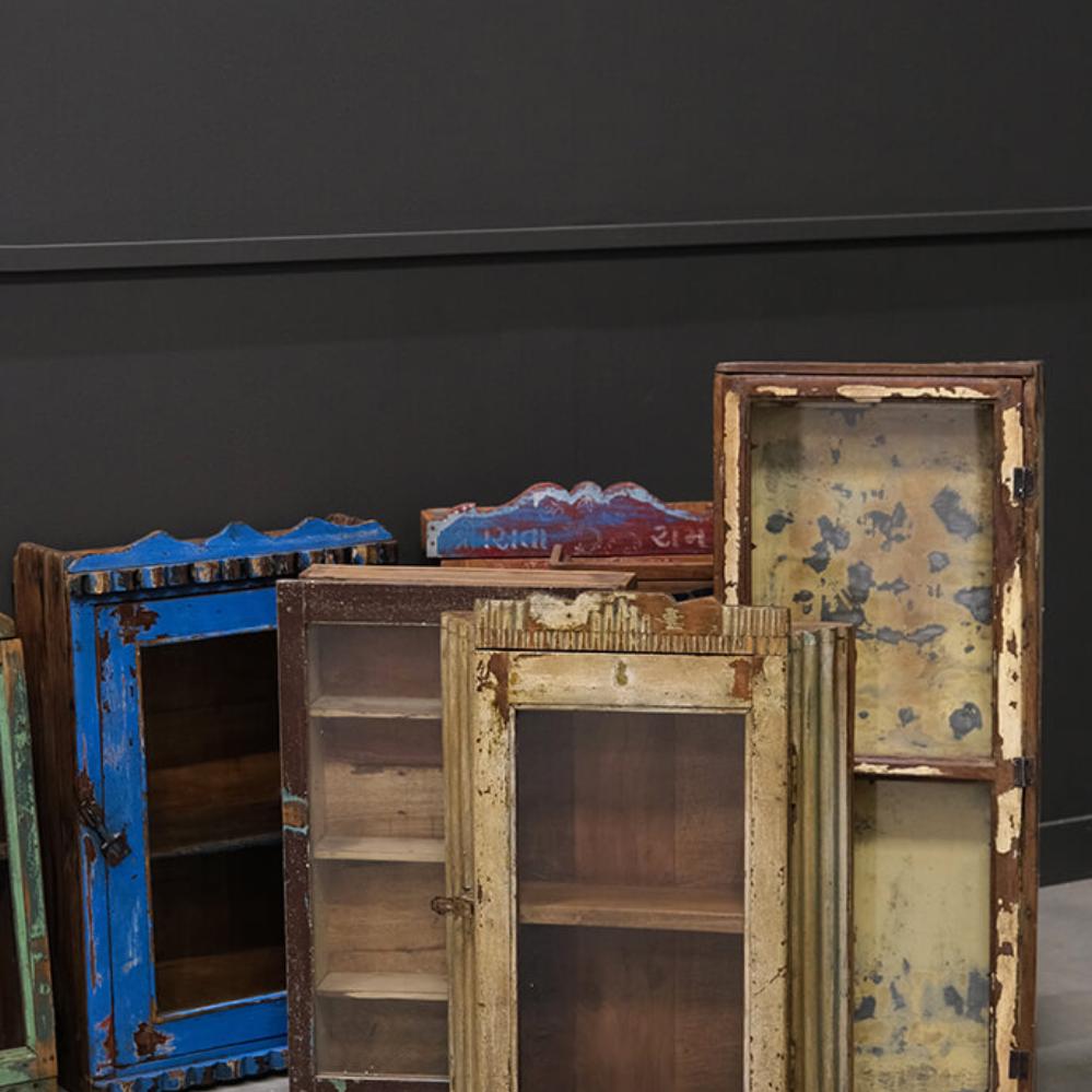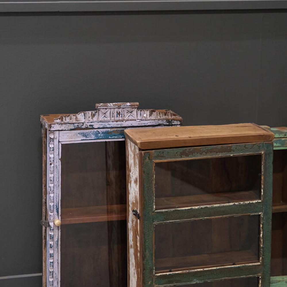 Disse vægskabe er charmerende møbler, hver især med sin egen farve og karakteristiske stil. Den farverige patina og de slidte detaljer giver vægskabene et råt og autentisk look. Disse skabe er perfekt til dig, der ønsker at tilføje personlighed og historie til din indretning, uanset om det er i din business eller dit private hjem. Med glaslåger og en række forskellige hylder kan skabene både fremvise og beskytte dine yndlingsgenstande. Skabene fås i forskellige udtryk og farver, som alle fremhæver skabenes vintage charme og robuste stil.