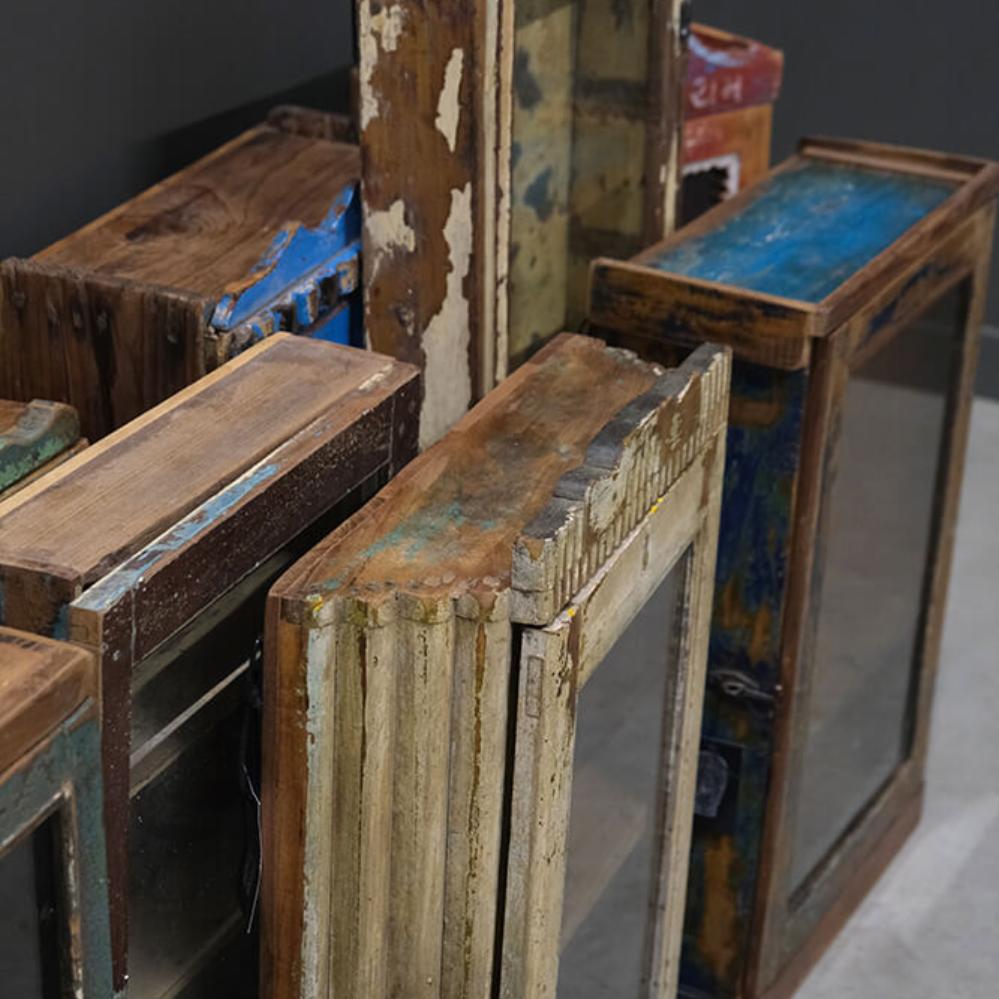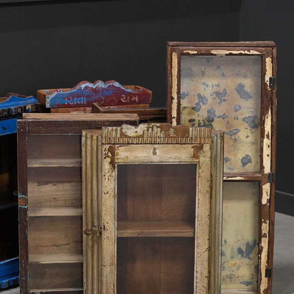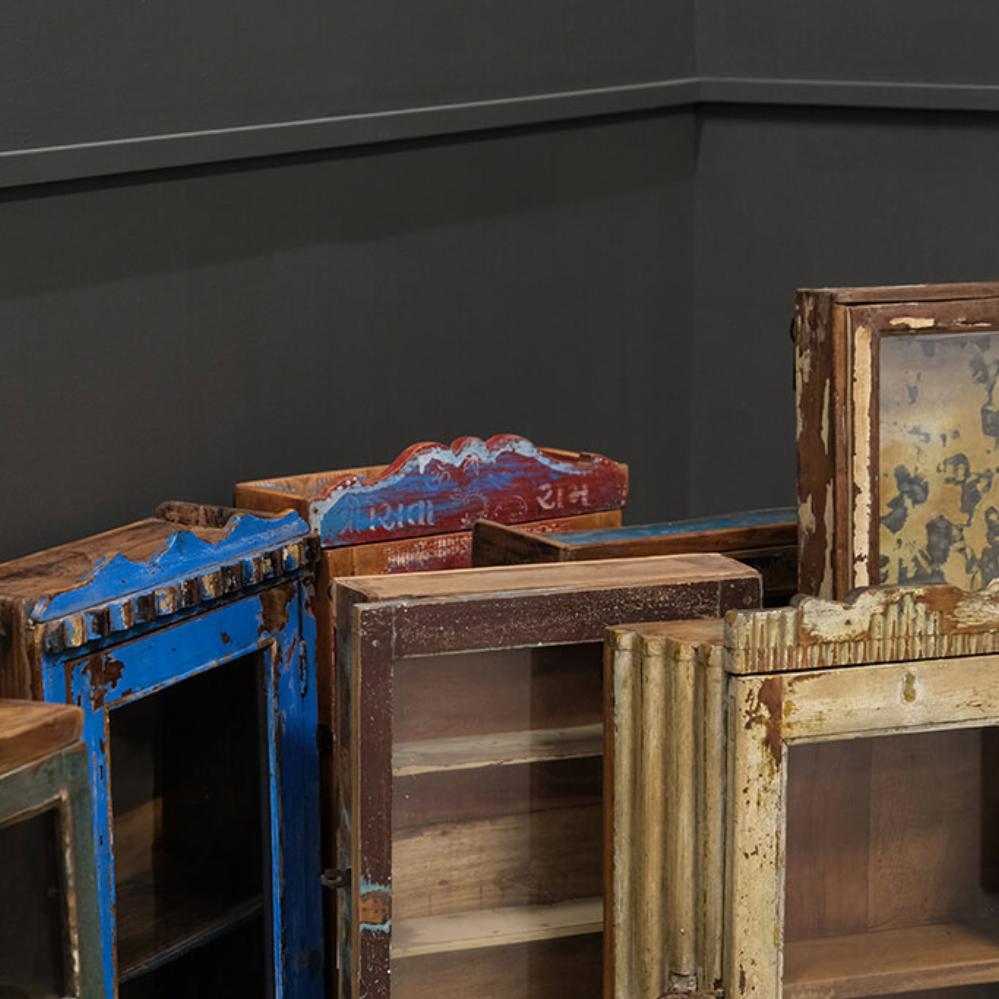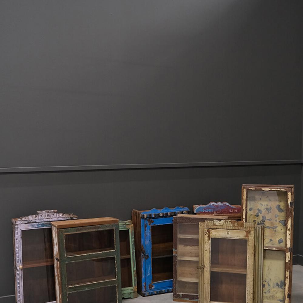 Disse vægskabe er charmerende møbler, hver især med sin egen farve og karakteristiske stil. Den farverige patina og de slidte detaljer giver vægskabene et råt og autentisk look. Disse skabe er perfekt til dig, der ønsker at tilføje personlighed og historie til din indretning, uanset om det er i din business eller dit private hjem. Med glaslåger og en række forskellige hylder kan skabene både fremvise og beskytte dine yndlingsgenstande. Skabene fås i forskellige udtryk og farver, som alle fremhæver skabenes vintage charme og robuste stil.