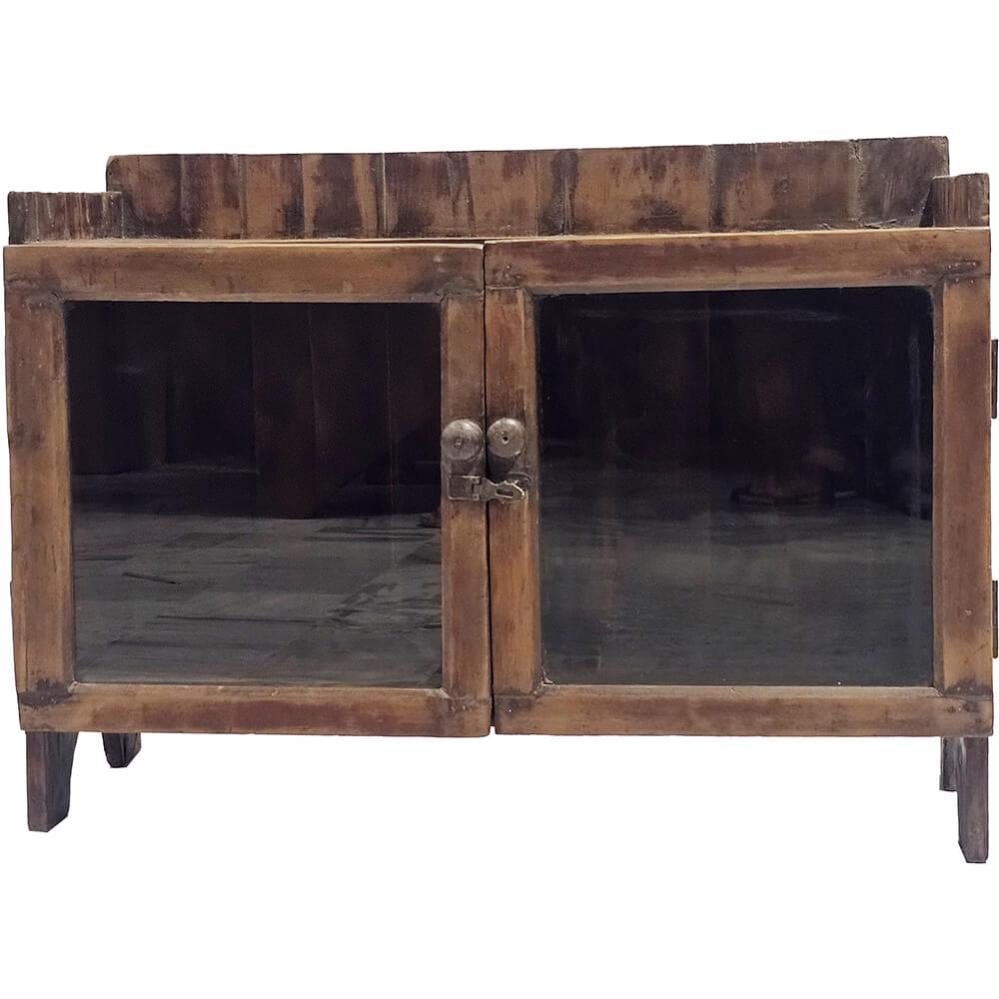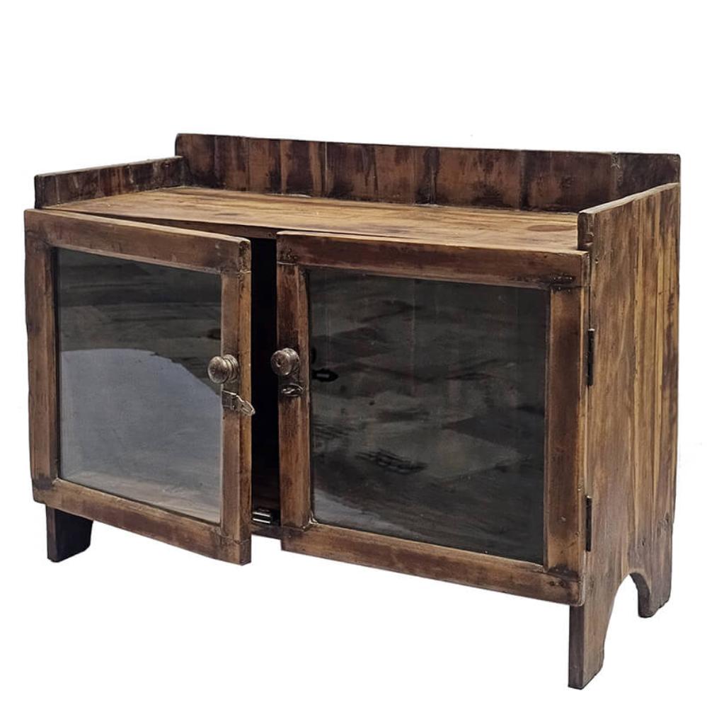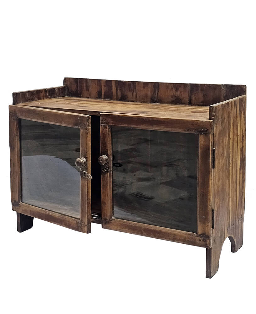 Denne fine lille skænk er fremstillet i træ med en varm, naturlig finish, der giver et autentisk og tidløst udtryk. De to glaslåger med enkle trærammer gør det nemt at udstille og opbevare dine yndlingsting, samtidig med at skænken bevarer et let og luftigt udseende. Det enkle udtryk med diskret patina og små håndværksdetaljer vidner om solidt håndværk og giver møblet masser af karakter. Skænken passer perfekt i stuen, entreen eller som en charmerende opbevaringsløsning i café- eller butiksindretningen. Et alsidigt møbel, der kombinerer praktisk funktionalitet med et rustikt, originalt udtryk.