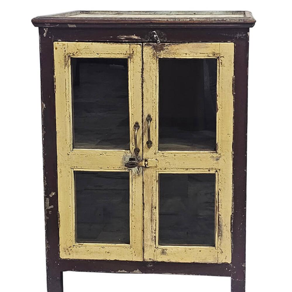 Dette lille vitrineskab er til dig, der leder efter det uperfekte og autentiske. Skabet er lavet i træ og har en slidstærk personlighed med sine afskallede farver i creme, gul og mørk brun. Glasset i lågerne giver et let udtryk, mens patinaen fortæller historier, som kun tid og brug kan skrive. Vitrineskabet er fundet i Indien og er et unika med sin helt egen farvekombination og skæve detaljer. Det er råt, ærligt og håndlavet, med tydelige spor af liv og brug, hvilket gør det til noget helt særligt. Brug vitrineskabet i køkkenet til kopper og glas, i butikken til udstilling eller i stuen som blikfang med både funktion og sjæl. Det fungerer lige så godt i en rustik restaurant som i et hjem, hvor der gerne må være lidt kant og karakter.