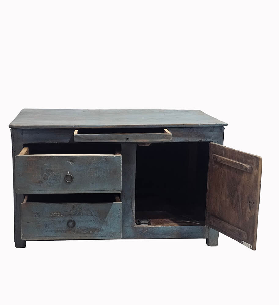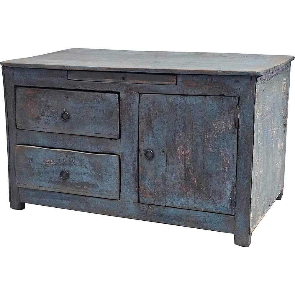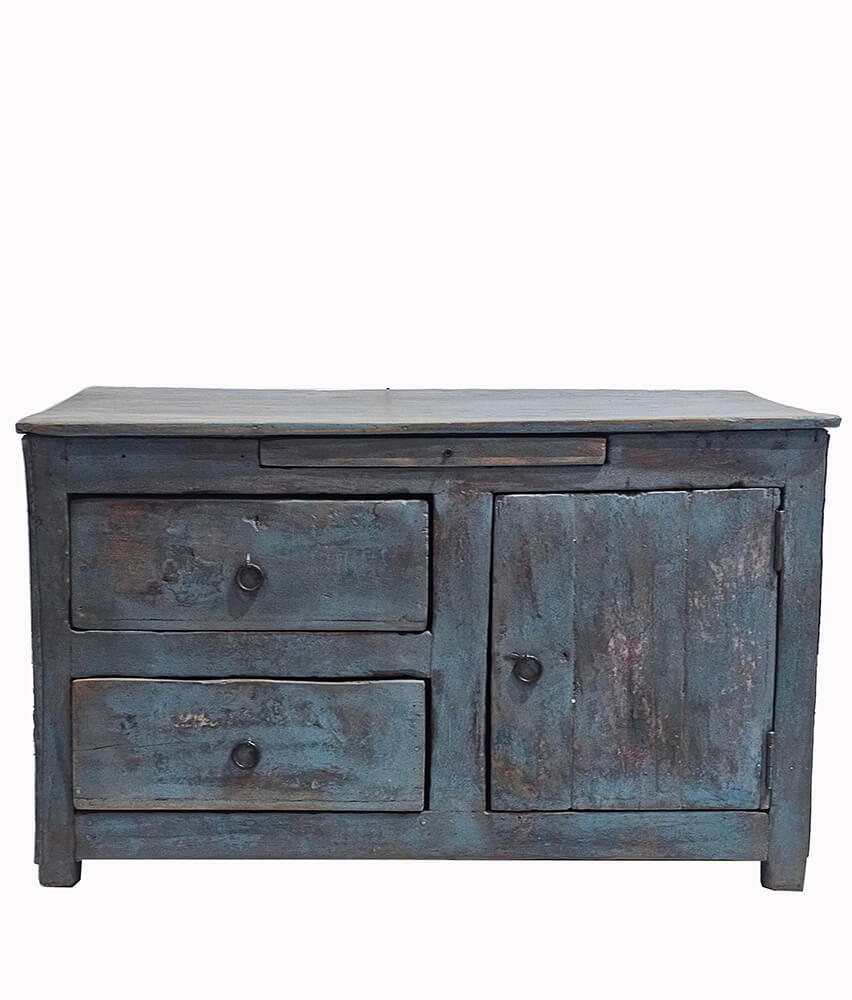 Den her kommode har ikke travlt med at være pæn. Og det er præcis derfor, den fungerer. Farven ligger et sted mellem støvet blå og grå – slidt, ujævn og fuld af liv. Overfladen er præget af tid og brug, og det kan ses. Skufferne er ikke perfekte; kanterne er lidt skæve, og det hele føles ærligt på den der måde, som man ikke kan fake. Du får tre skuffer og et skab med god plads til alt det, der ikke behøver at stå fremme. Det er praktisk, men det er ikke det, der gør den interessant. Det er udtrykket. Den lidt rå, næsten tilfældige finish, som gør, at den aldrig bliver poleret og kedelig. Det her er en kommode, der ikke prøver at passe ind. Den gør det alligevel. Bare på sin egen måde.