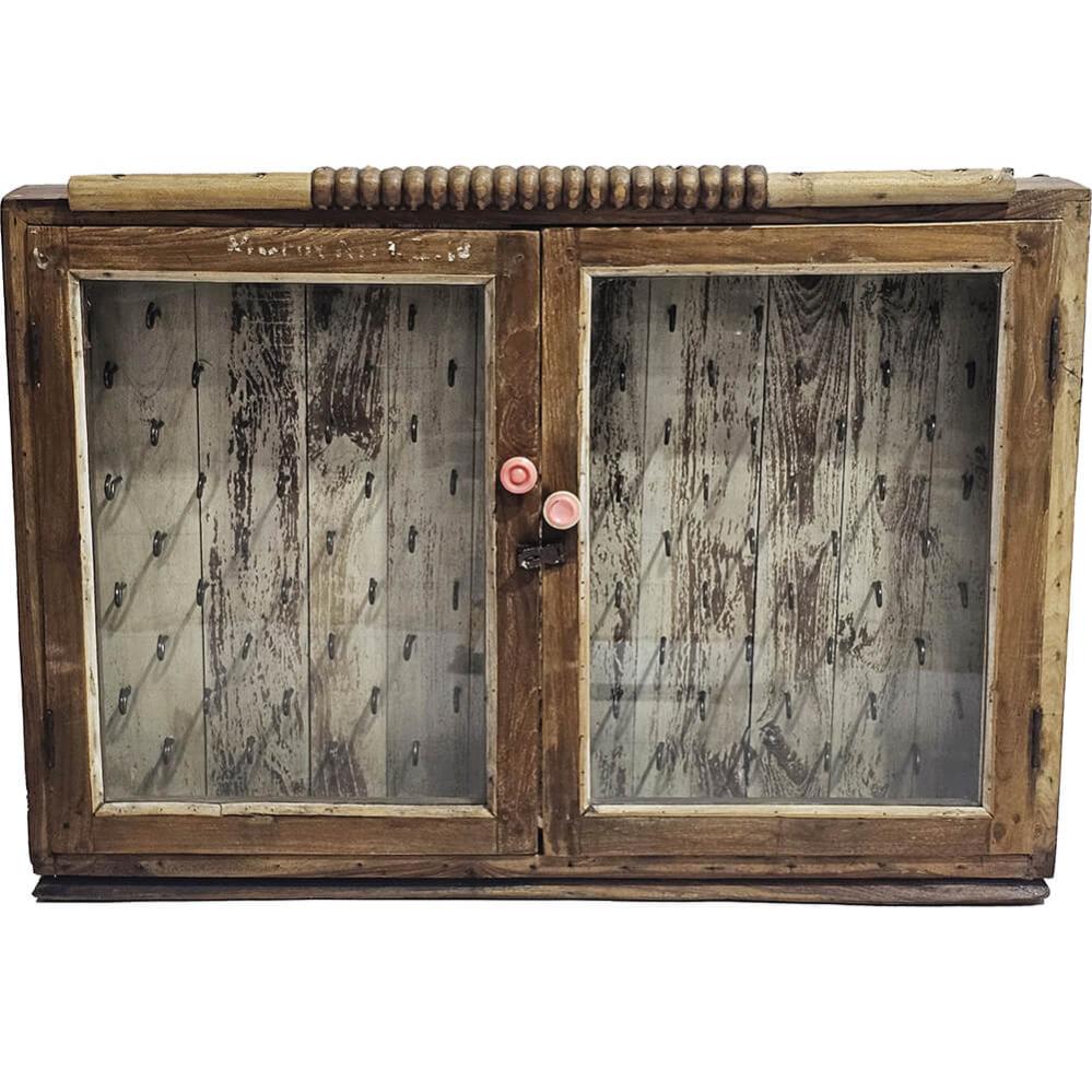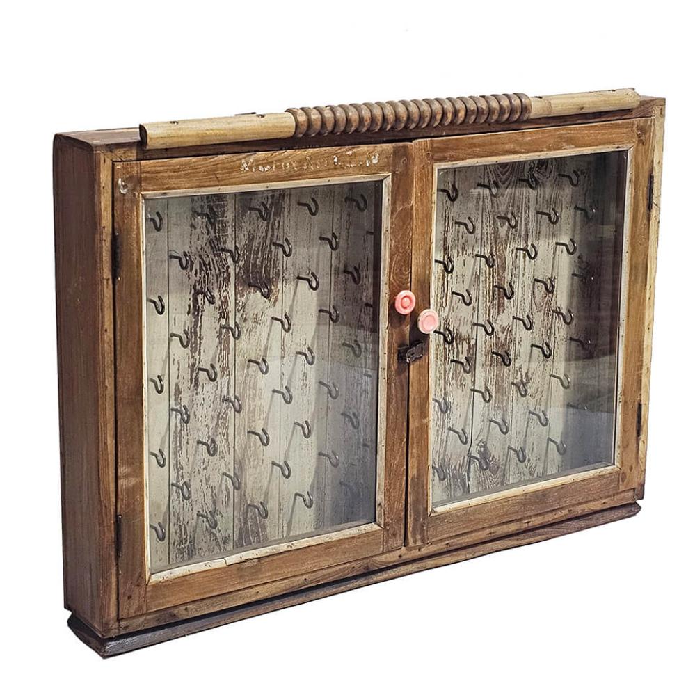 Dette charmerende gamle nøgleskab er en lille skat fra fortiden, fyldt med charme og patina. Skabet har to glaslåger, fine lyserøde porcelænsgreb og en indvendig bagplade med rækker af små kroge, der giver plads til mange nøgler. Toppen er pyntet med en dekorativ trædetalje, der understreger det håndlavede præg, og den slidte træoverflade fortæller sin egen historie. Vi får kun nøgleskabet hjem i et meget lille parti, og selvom de enkelte skabe ligner hinanden, har hvert stykke sit helt eget udtryk. Perfekt til entréen, butikken eller som dekorativ opbevaring i hjemmet for dig, der elsker unikke fund med kant.
