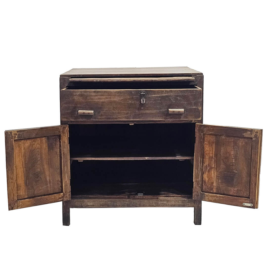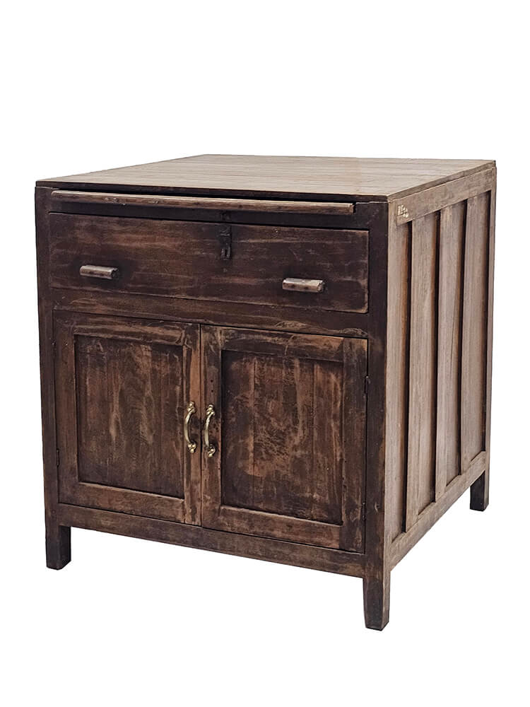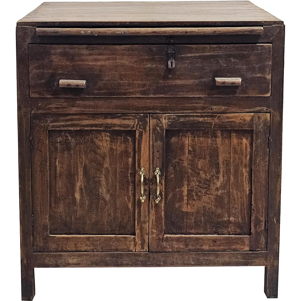 Gammelt skolemøbel i massivt træ med smuk patina og tydelige spor fra et langt liv i brug. Møblet har en karakteristisk udtrækbar skriveplade, som giver ekstra arbejds- eller afsætningsplads, når der er brug for det. En fin og funktionel detalje, der understreger møblets oprindelige anvendelse. Under skrivepladen finder du en rummelig skuffe, perfekt til opbevaring af papirer, notesbøger eller småting. Bag de to låger er der god opbevaringsplads med hylde, som gør møblet både praktisk og alsidigt i hverdagen. Møblet egner sig oplagt som et lille skrivebord, konsolbord, entrémøbel eller som et dekorativt og funktionelt opbevaringsmøbel i stue, kontor eller soveværelse. Den varme trætone og den slidte overflade giver masser af charme og personlighed, og hvert mærke og farveskift fortæller sin egen historie. Et helt særligt møbel for dig, der holder af autentiske fund med karakter og funktion i én og samme løsning.