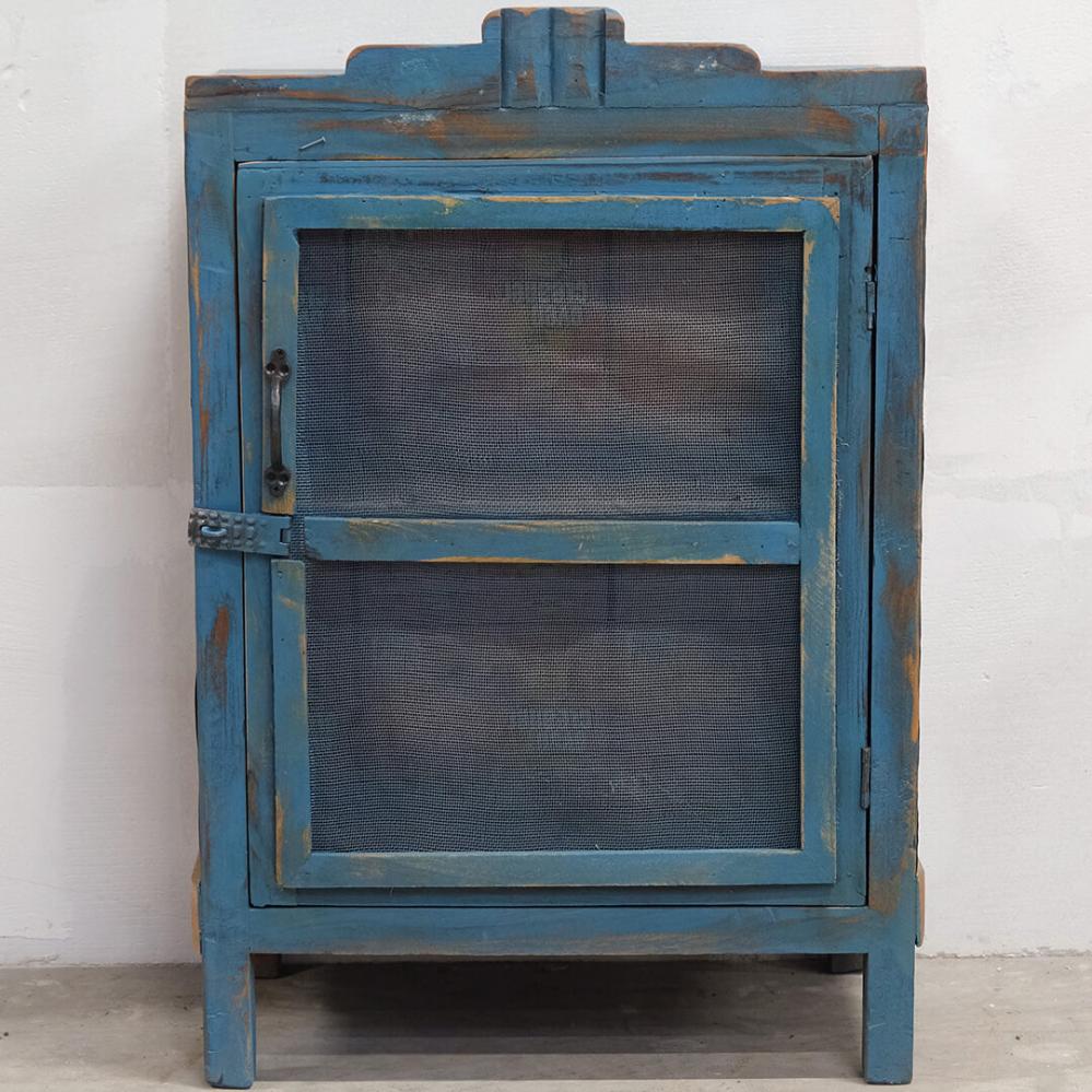 Gammelt træskab med trådnet - blå