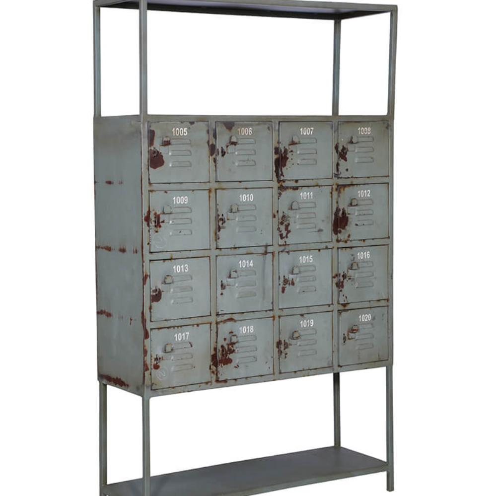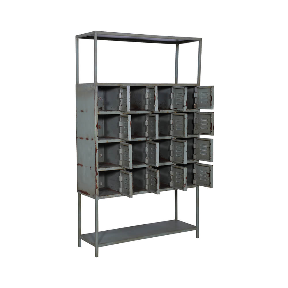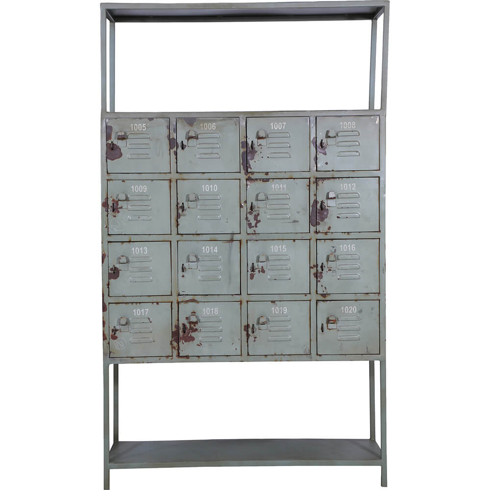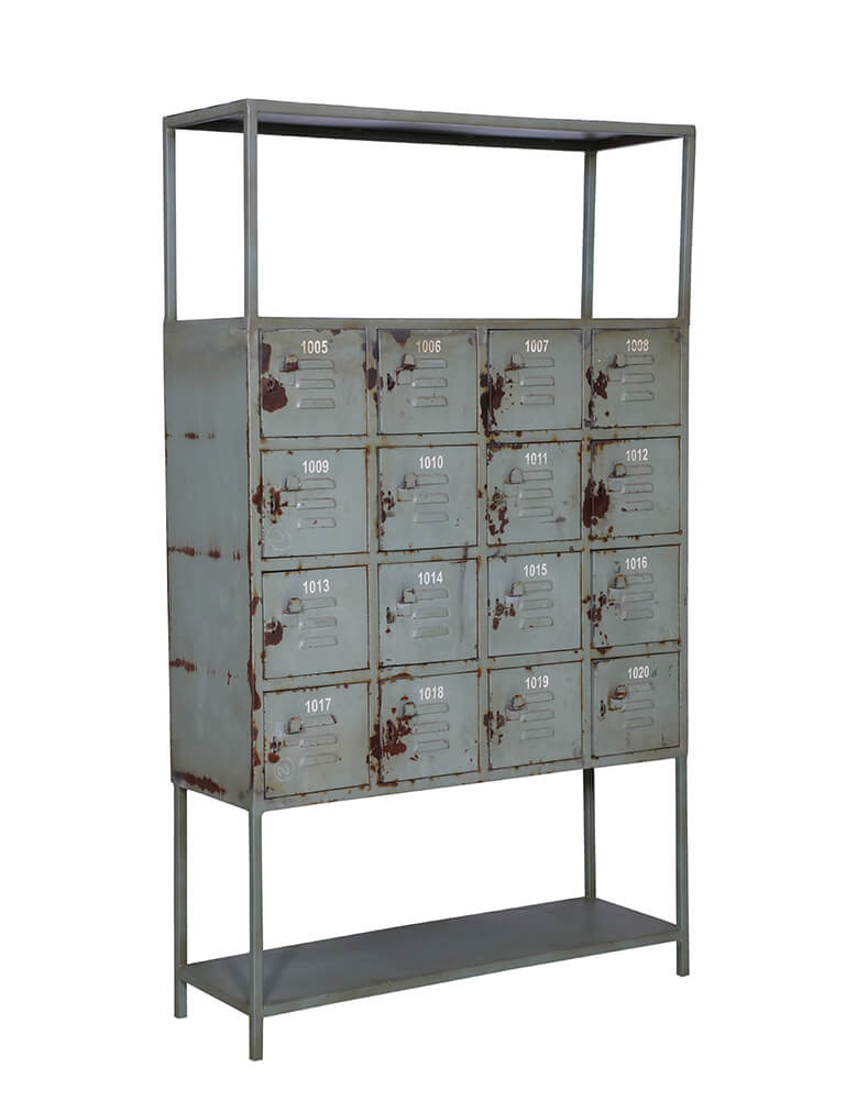 Skøn reol, skabt af et gammelt lockerskab af jern, er en unik og charmerende tilføjelse til din indretning. Med sine 16 nummererede rum med låger og 2 hylder giver det dig rigelig opbevaringsplads til dine ejendele. Reolen har en smuk patina, der tilføjer karakter og historie til enhver indretning. Skab en unik stil med denne genopfundne og funktionelle reol.