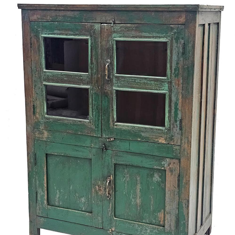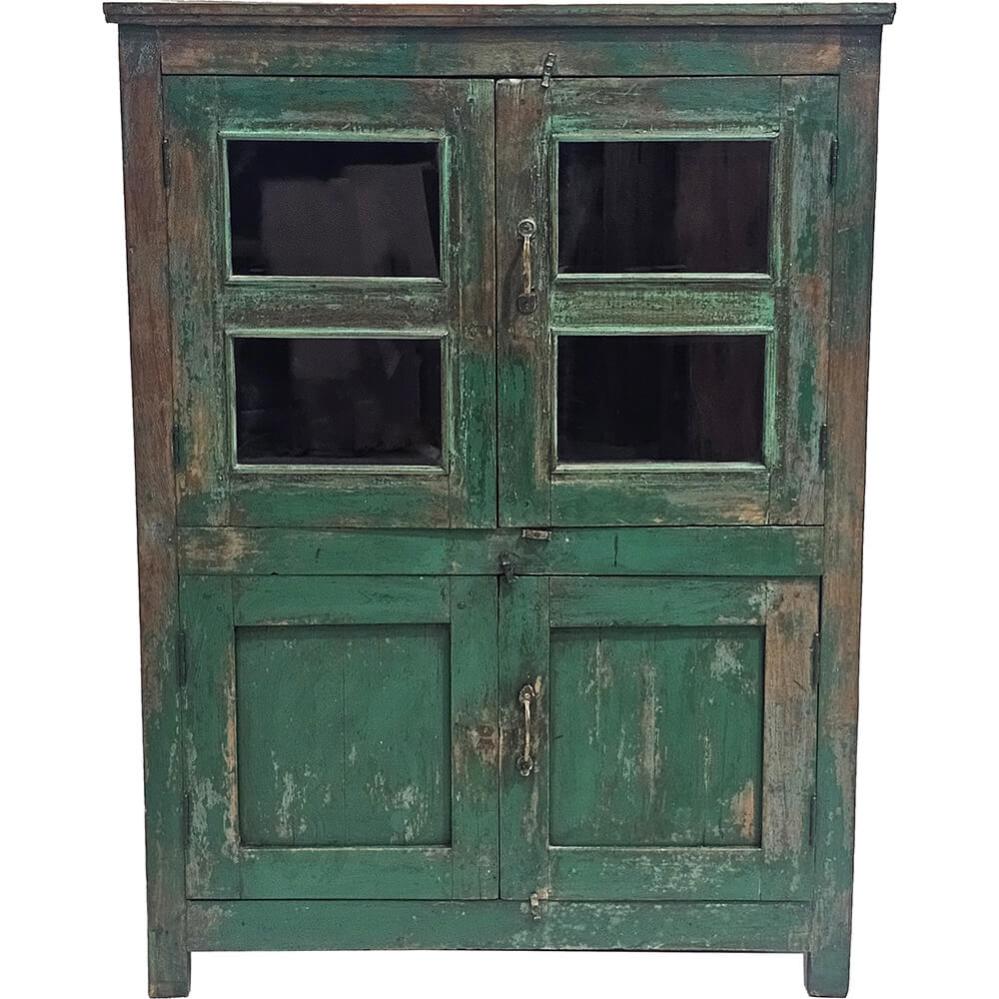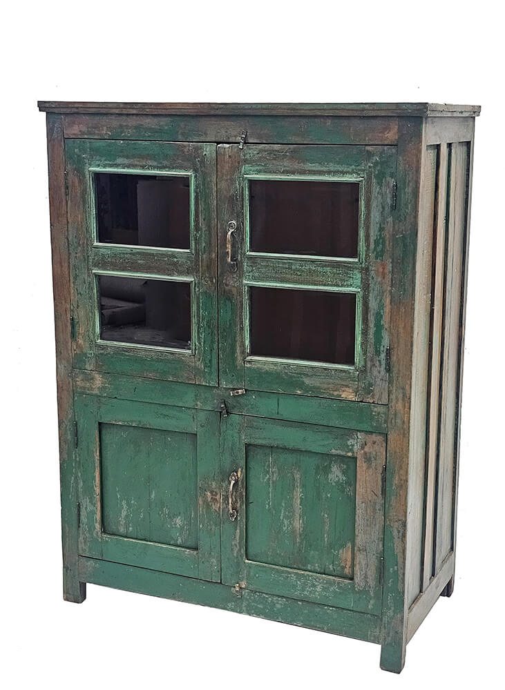 Smuk grøn vitrine med fire låger, der kombinerer funktionalitet med et autentisk, rustikt udtryk. Træskabet har en smukt patineret overflade, hvor den grønne maling fremstår med naturligt slid og karakter. De øverste låger er med glas, så du nemt kan fremvise dit yndlingsservice, bøger eller dekorative genstande, mens de nederste låger giver mulighed for diskret opbevaring. Et alsidigt møbel, der tilfører varme og personlighed til både køkken, stue eller entré – og som med sin farve og struktur bliver et markant blikfang i indretningen.