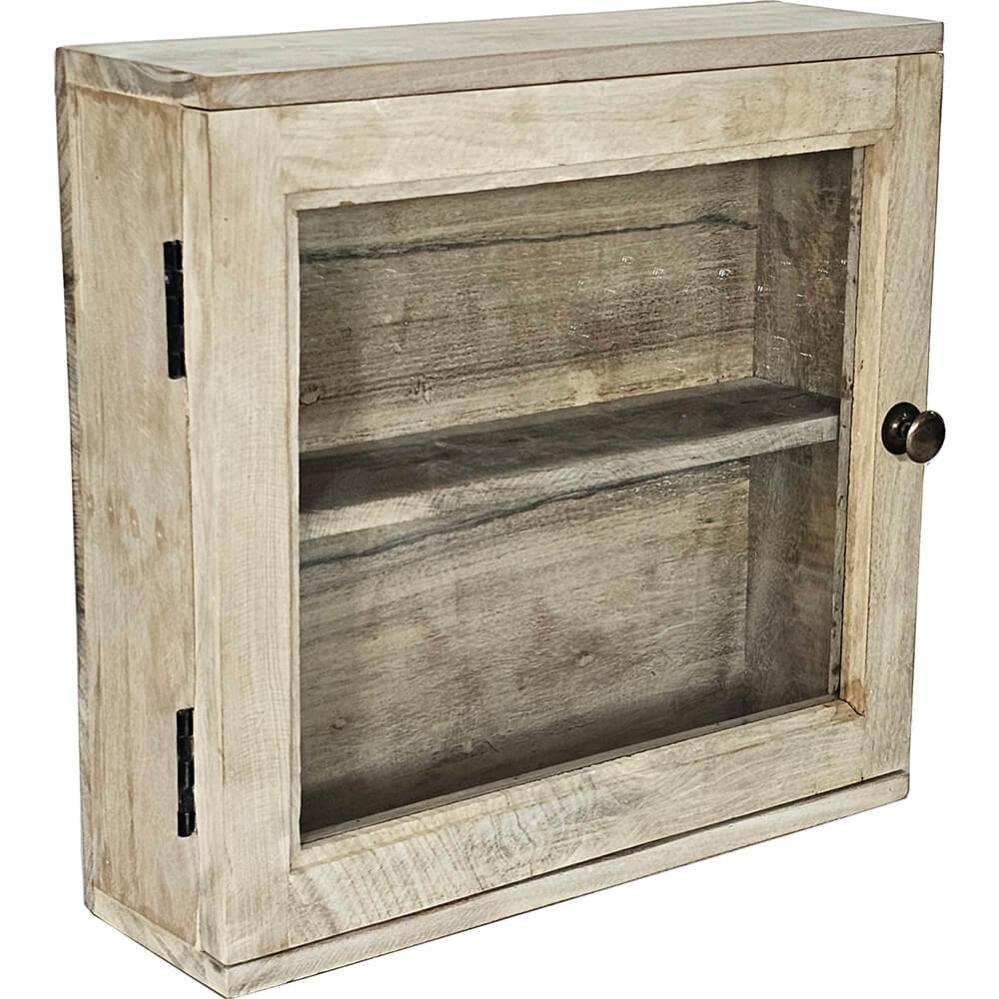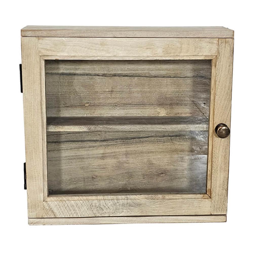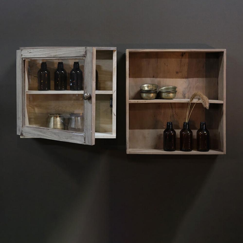 Charmerende og praktisk lille vægskab med glaslåge og en hylde. Skabet er lavet af genanvendt træ, hvilket giver det en naturlig og rustik charme. Glaslågen giver dig mulighed for at vise dine yndlingsgenstande frem. Placer det i cafeen, på badeværelset eller i køkkenet for at tilføre en hyggelig atmosfære og organisere dine småting på en stilfuld måde. Afstanden mellem hylderne er 21 cm.