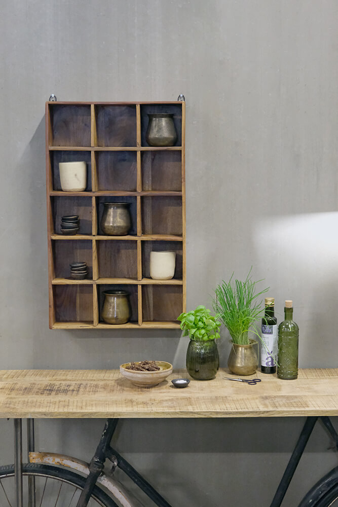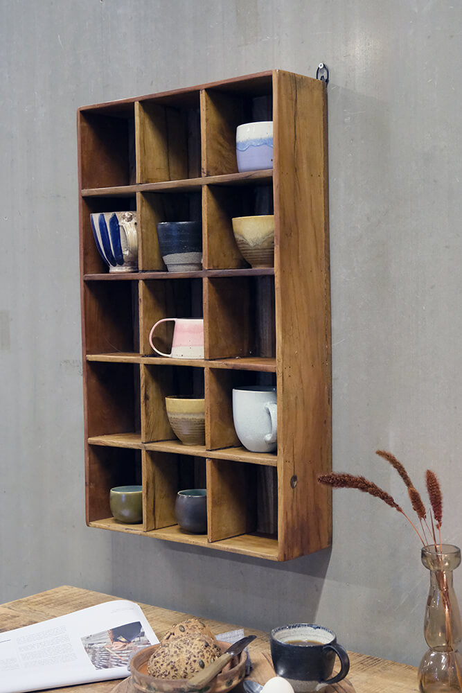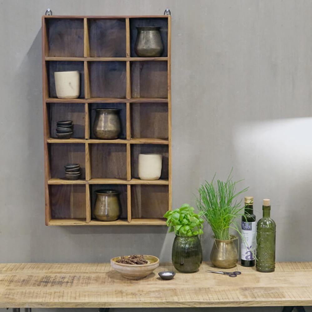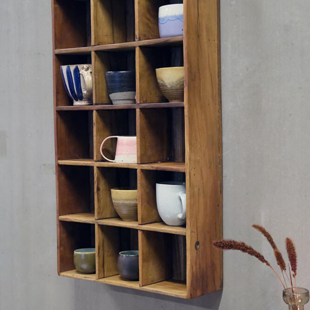 Denne kopreol i genanvendt træ er til dig, der har en svaghed for både struktur og sjæl. Reolen giver dig rig mulighed for at organisere dine kopper, krydderier eller små fund med sine 15 rum. Og det skønne, varme træ med naturlige nuancer og åretegninger gør, at du ikke behøver gå på kompromis med stilen. Reolen leveres med to små hjørnebeslag og kan hænges op både lodret og vandret, alt efter plads og temperament. Brug den i køkkenet, i butikken eller hvor du har brug for lidt rå orden i hverdagen. Et funktionelt og dejligt møbel med masser af karakter, præcis som det skal være.