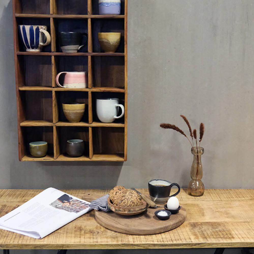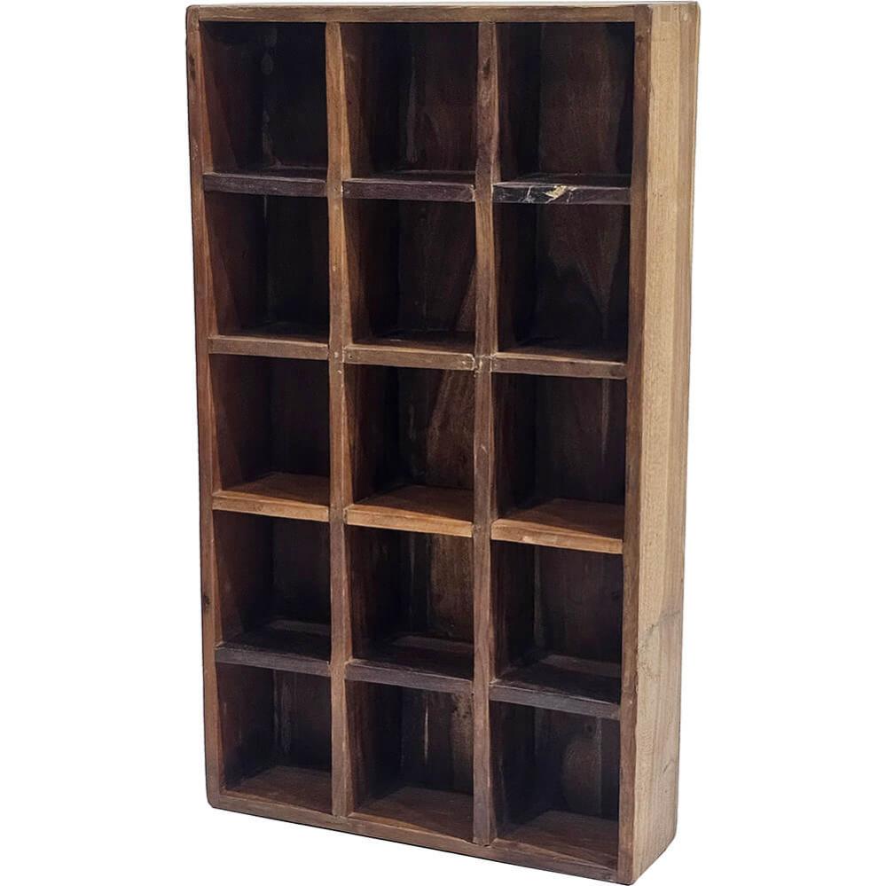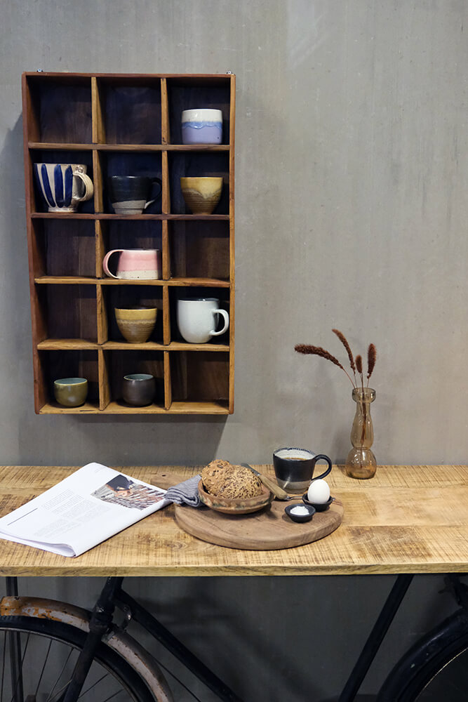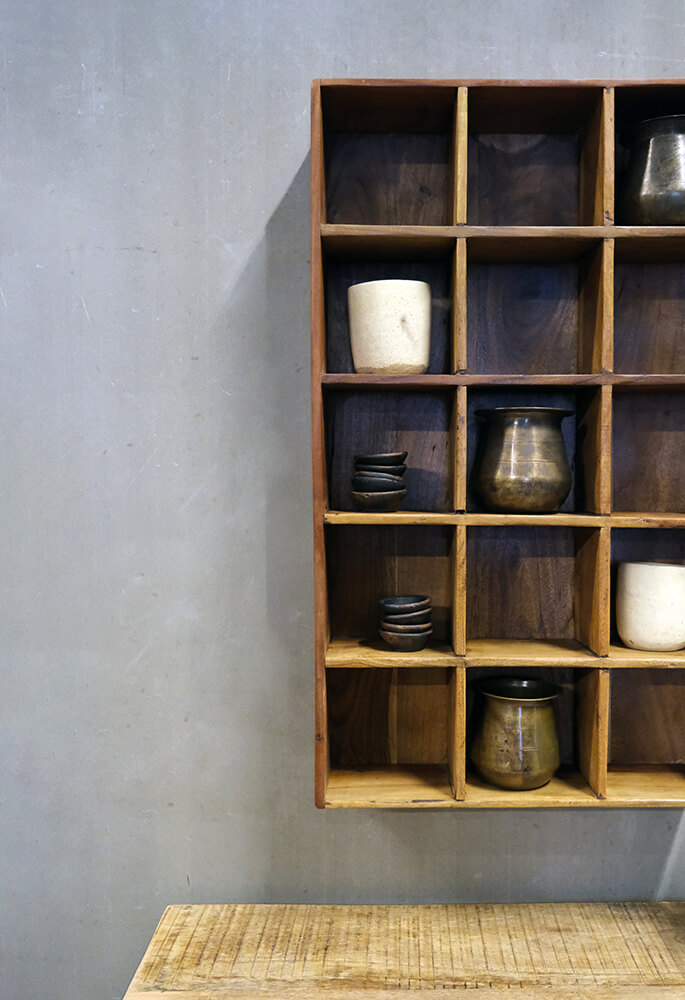 Denne kopreol i genanvendt træ er til dig, der har en svaghed for både struktur og sjæl. Reolen giver dig rig mulighed for at organisere dine kopper, krydderier eller små fund med sine 15 rum. Og det skønne, varme træ med naturlige nuancer og åretegninger gør, at du ikke behøver gå på kompromis med stilen. Reolen leveres med to små hjørnebeslag og kan hænges op både lodret og vandret, alt efter plads og temperament. Brug den i køkkenet, i butikken eller hvor du har brug for lidt rå orden i hverdagen. Et funktionelt og dejligt møbel med masser af karakter, præcis som det skal være.